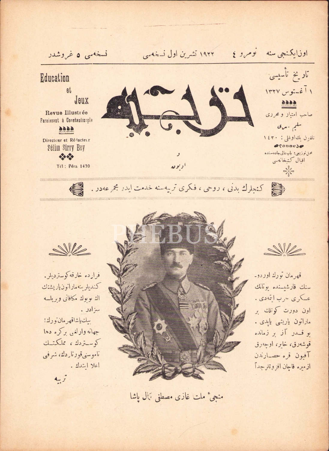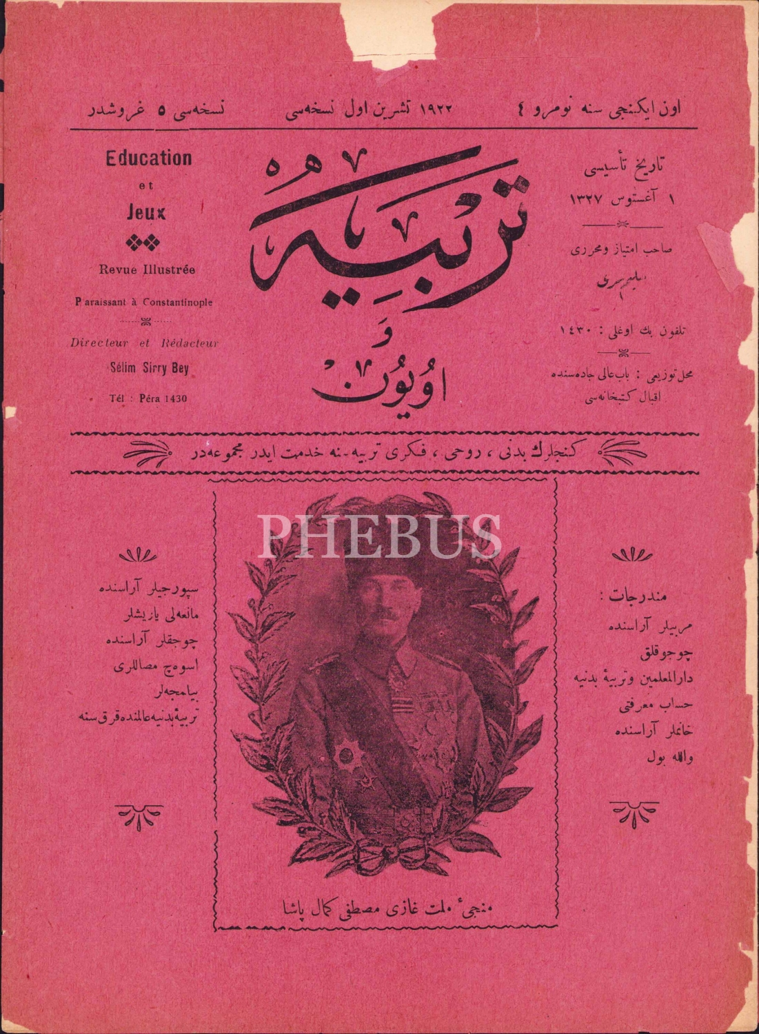 Selim Sırrı Tarcan'ın çıkarttığı 'Terbiye ve Oyun' Mecmuası, Kapak: Gazi Mustafa Kemal Atatürk, Numara:4, 1922 Teşrin-i Evvel Nüshası, kapakları ayrı vaziyette haliyle, 16 sayfa, Osmanlıca, 21x28 cm