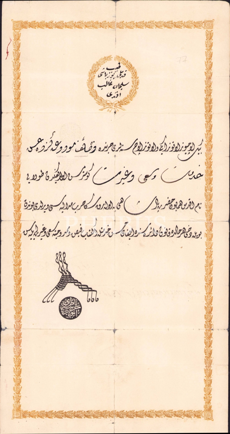Çanakkale Hastanesi'nde görevli Doktor Kosovalı Yüzbaşı Süleyman Galib Efendi'ye Birinci Cihan Harbi esnasında madalya verildiğine dair, Enver Paşa damgalı ve pençe mühürlü, 22x41 cm.