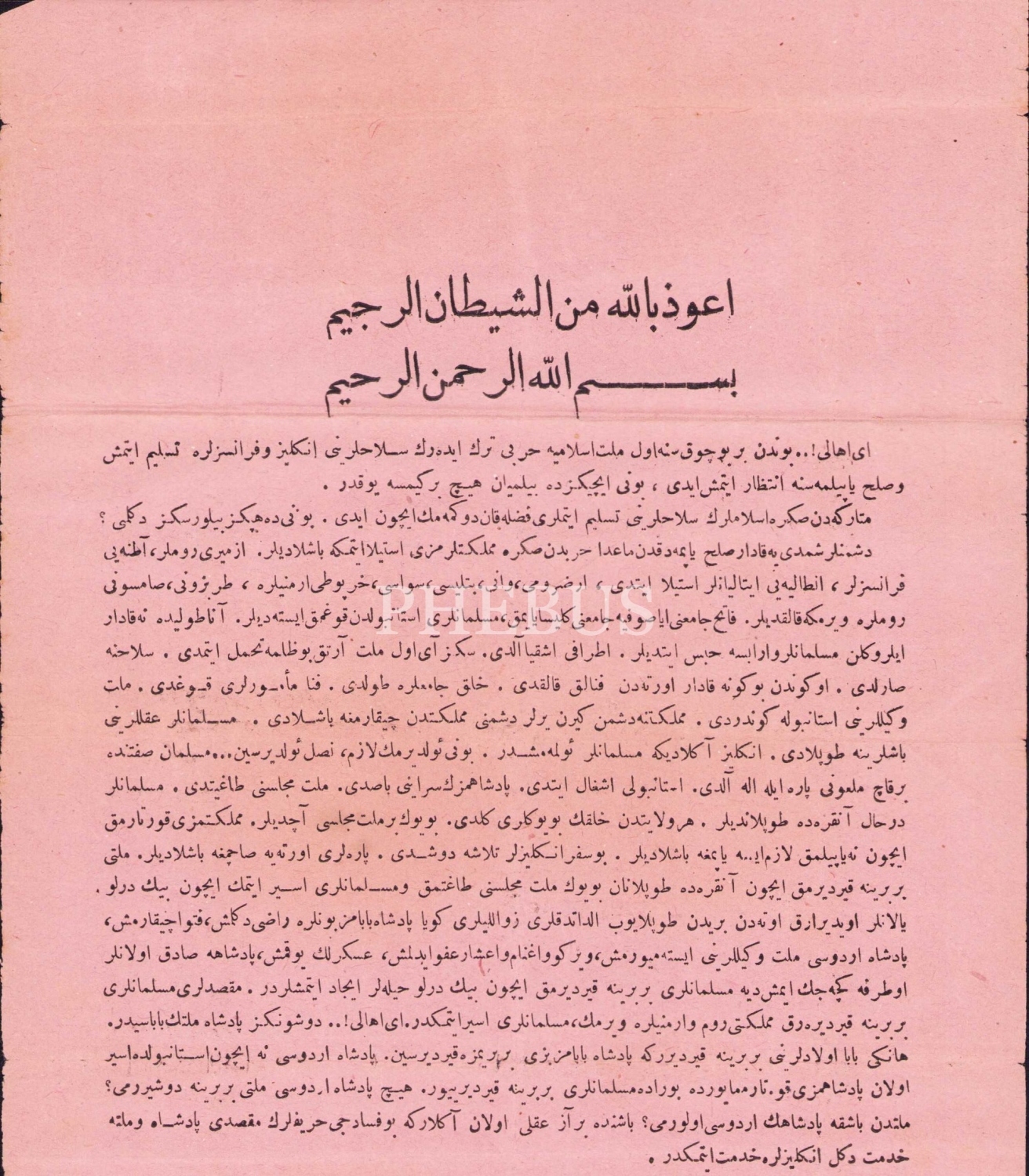 Metinde İstanbul, İzmir ve Anadolu'nun muhtelif yerlerinin işgal edildiğinden bahsedilmekte, halkın padişahın otoritesinden ayrılmaması gerektiği vurgulanmaktadır. Aznavur İsyanı'ndan bahsedilerek bu gibi isyan hareketlerinin kafirce hareketler olduğu vurgulanmıştır.