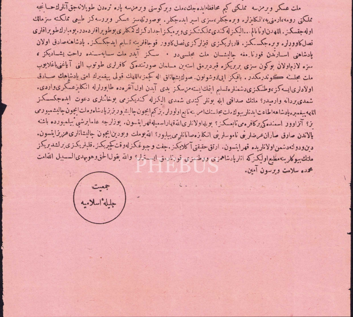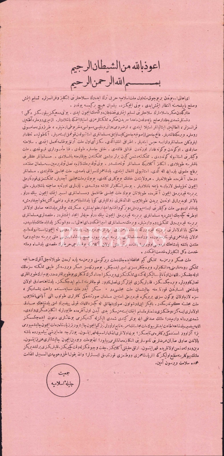 İstanbul ve Anadolu'nun işgali sonrası Cemiyet-i Celile-i İslamiye tarafından yayınlanan milli ve dini propaganda ilanı, Osmanlıca, 21x48 cm