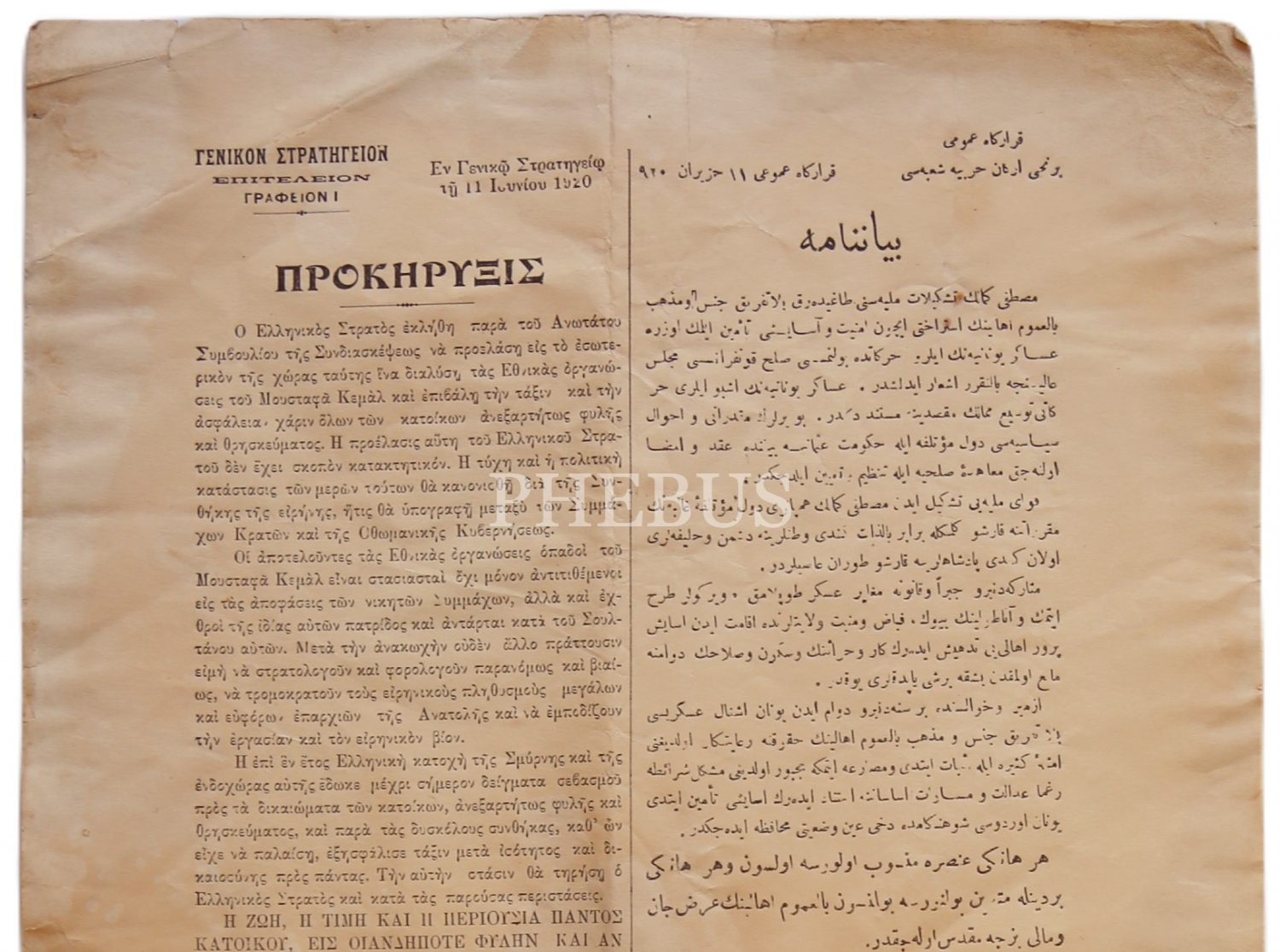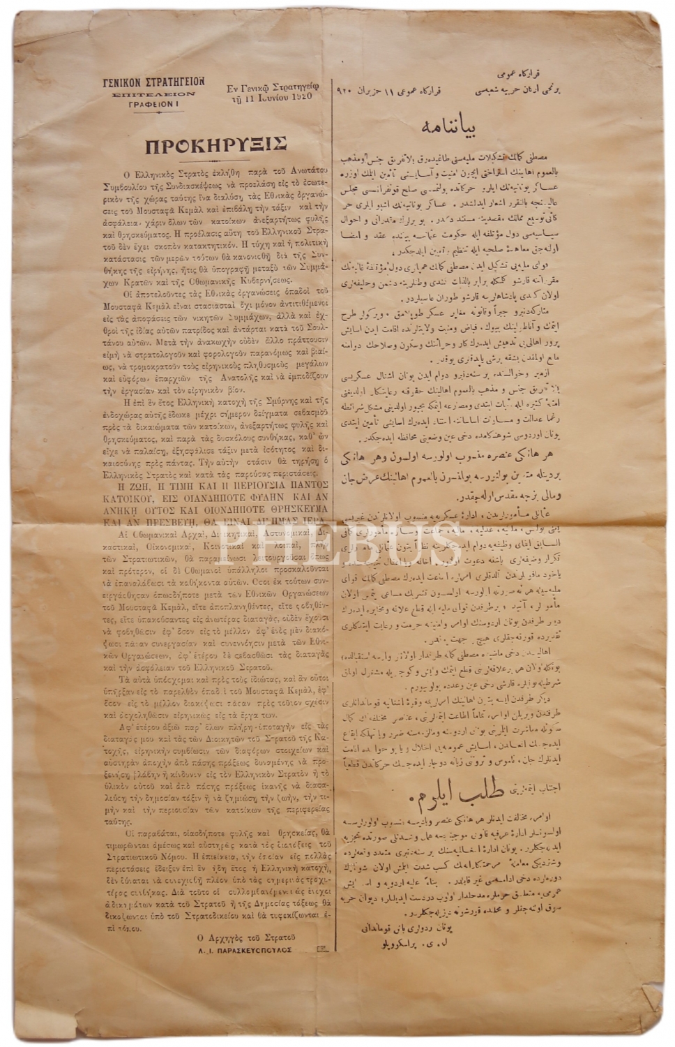 İzmir'deki Yunan birliklerinin başkomutanı L. Paraskevopulos tarafından yayınlanan ve Mustafa Kemal Atatürk ile Kuva-yı Milliye'yi düşman gösteren Yunan Ordusu Beyannamesi, 11 Haziran 1920 tarihli, Osmanlıca ve Rumca, 29x46 cm