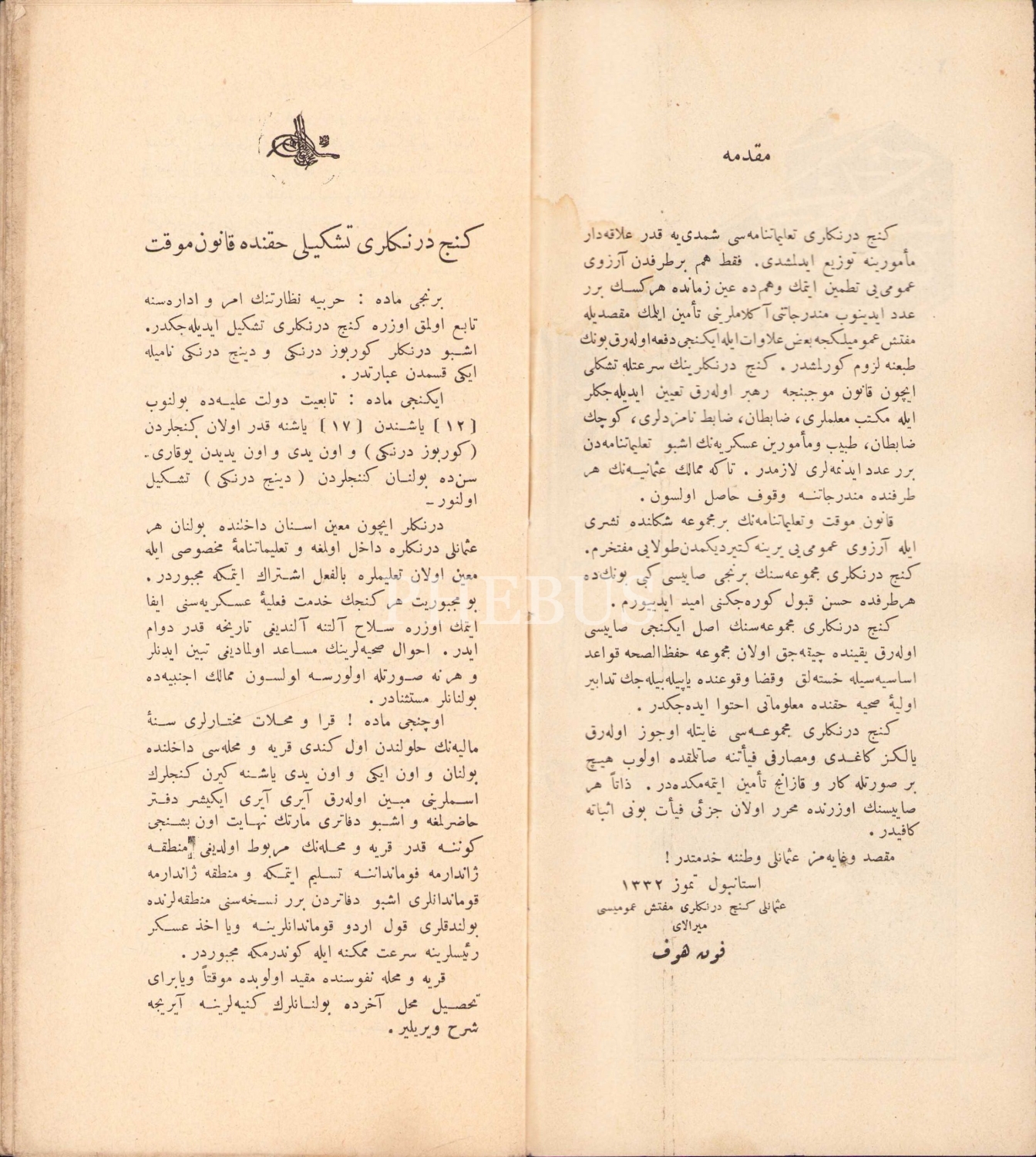 Osmanlı Genç Dernekleri Teşekkülü Hakkında Kanun-ı Muvakkat [Geçici Kanun] ve Talimatname, Genç Dernekleri Kütüphanesi, Von Hof, Evkaf-ı İslamiye Matbaası, 1334 tarihli, 35 sayfa, 11x24 cm.