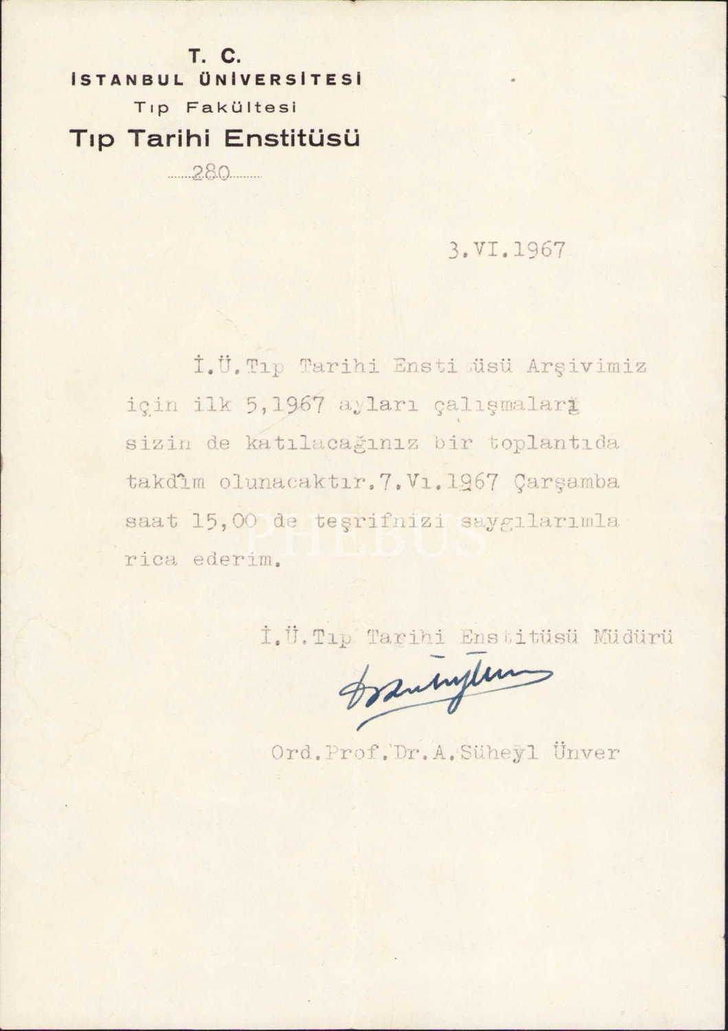 Ahmed Süheyl Ünver ıslak imzalı İstanbul Tıp Tarihi Enstitüsü Arşivi toplantı daveti, 1967 tarihli, 14x20 cm
