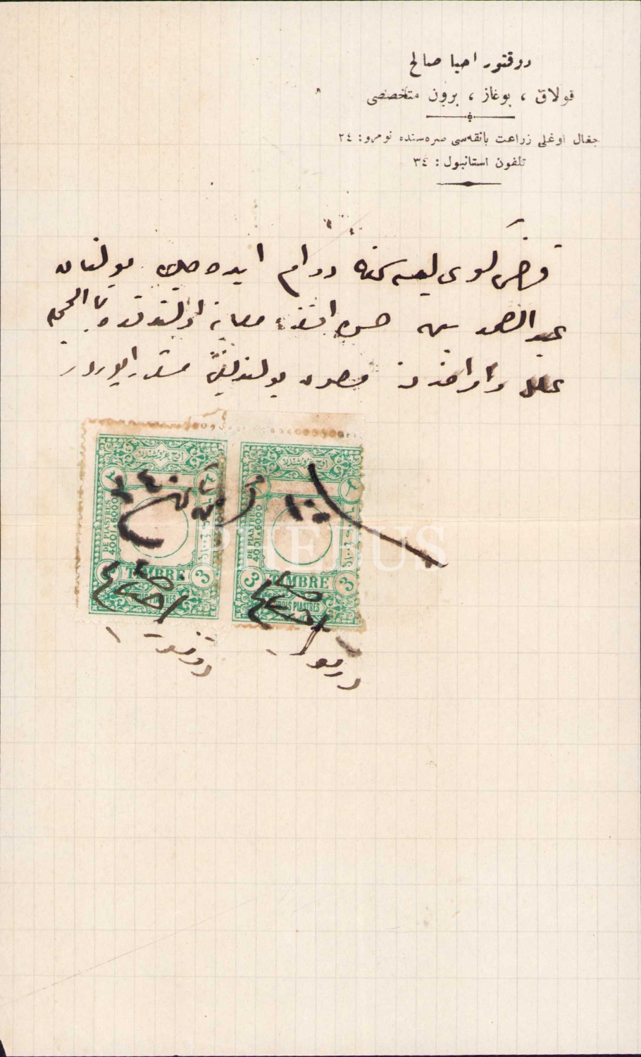 Türkiye Kulak Burun Boğaz Derneği'nin Kurucularından Dr. İhya Salih [İsanç]'a ait muayene raporu, 1340 tarihli, Osmanlıca, pullu, Doktor İhya Salih'ten imzalı, 12x20,5 cm