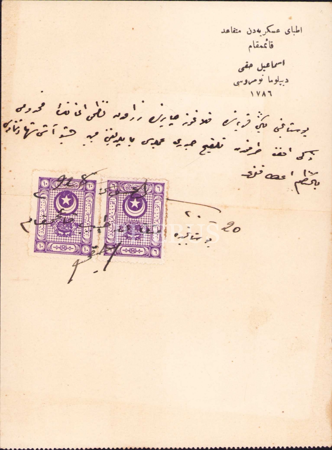 Askeri Doktorlardan Emekli Kaymakam İsmail Hakkı antetli Osmanlıca aşı şehadetnamesi verildiğine dair rapor, pullu, 1928 tarihli, 13x17 cm