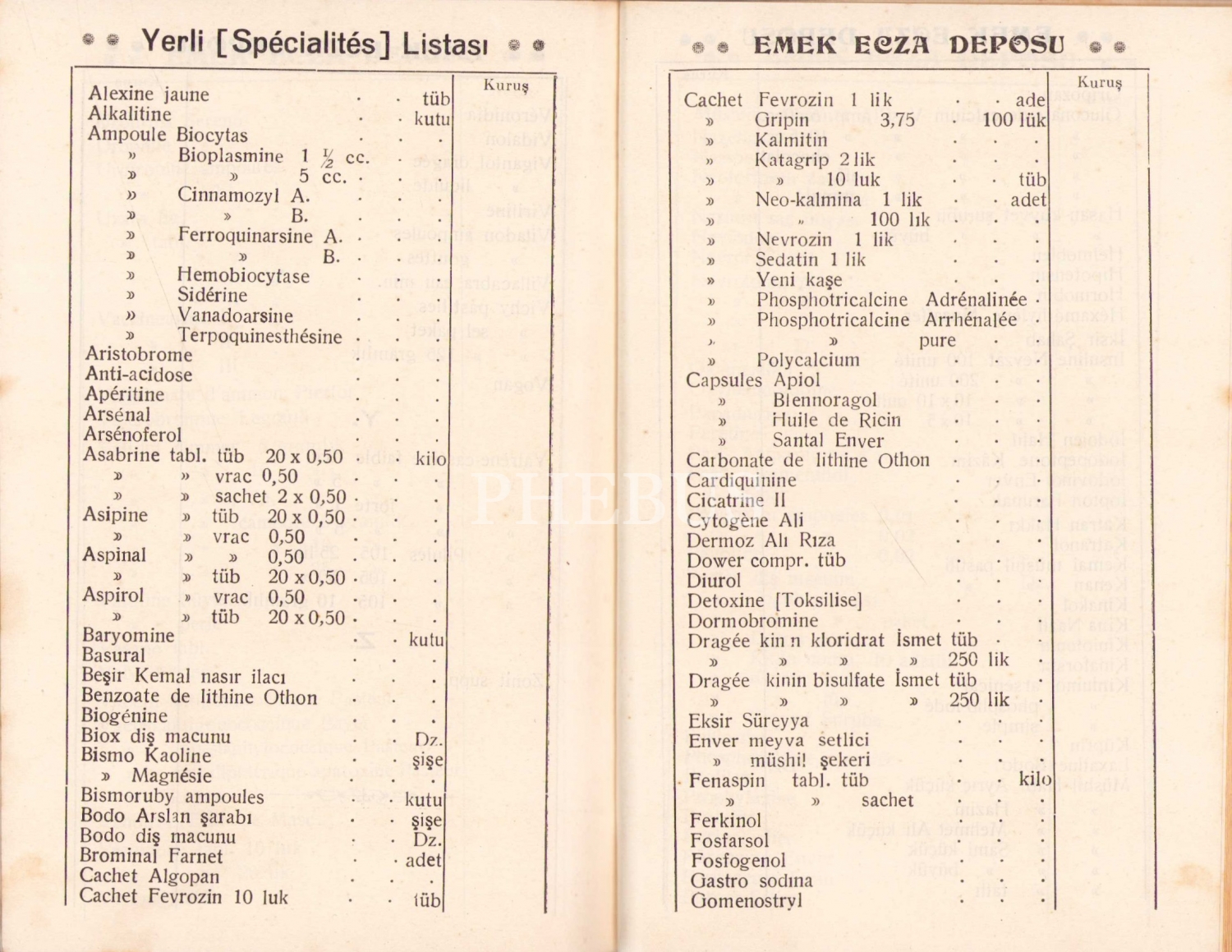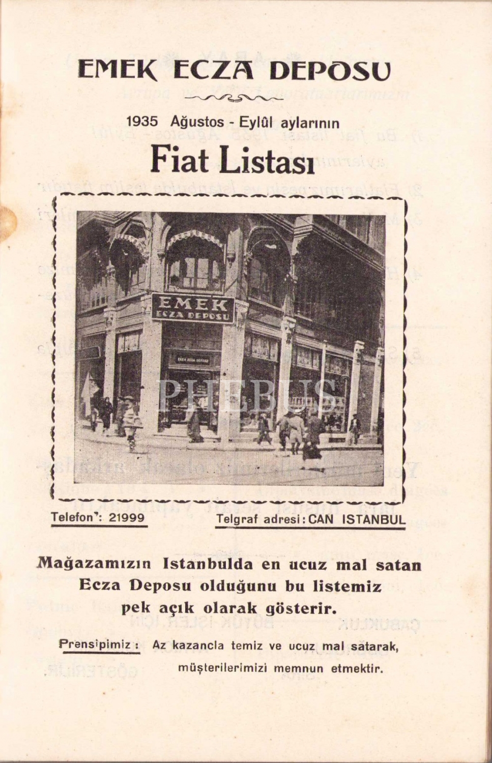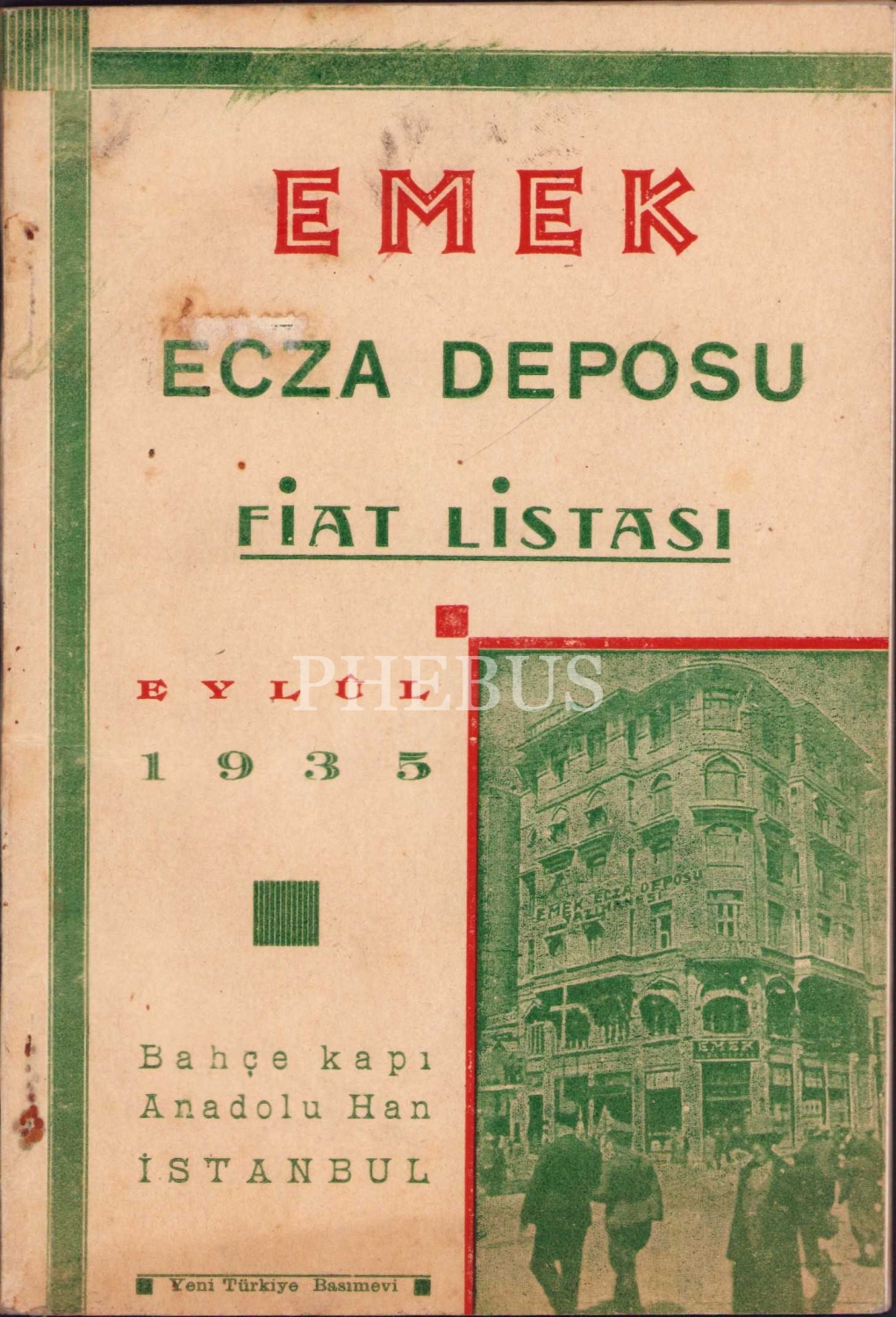 Emek Ecza Deposu Fiyat Listesi, Eylül 1935 tarihli, Bahçe Kapı Anadolu Han İstanbul, 44 sayfa, arkasında muhtelif reklam ilanlarıyla, 12,5x18 cm