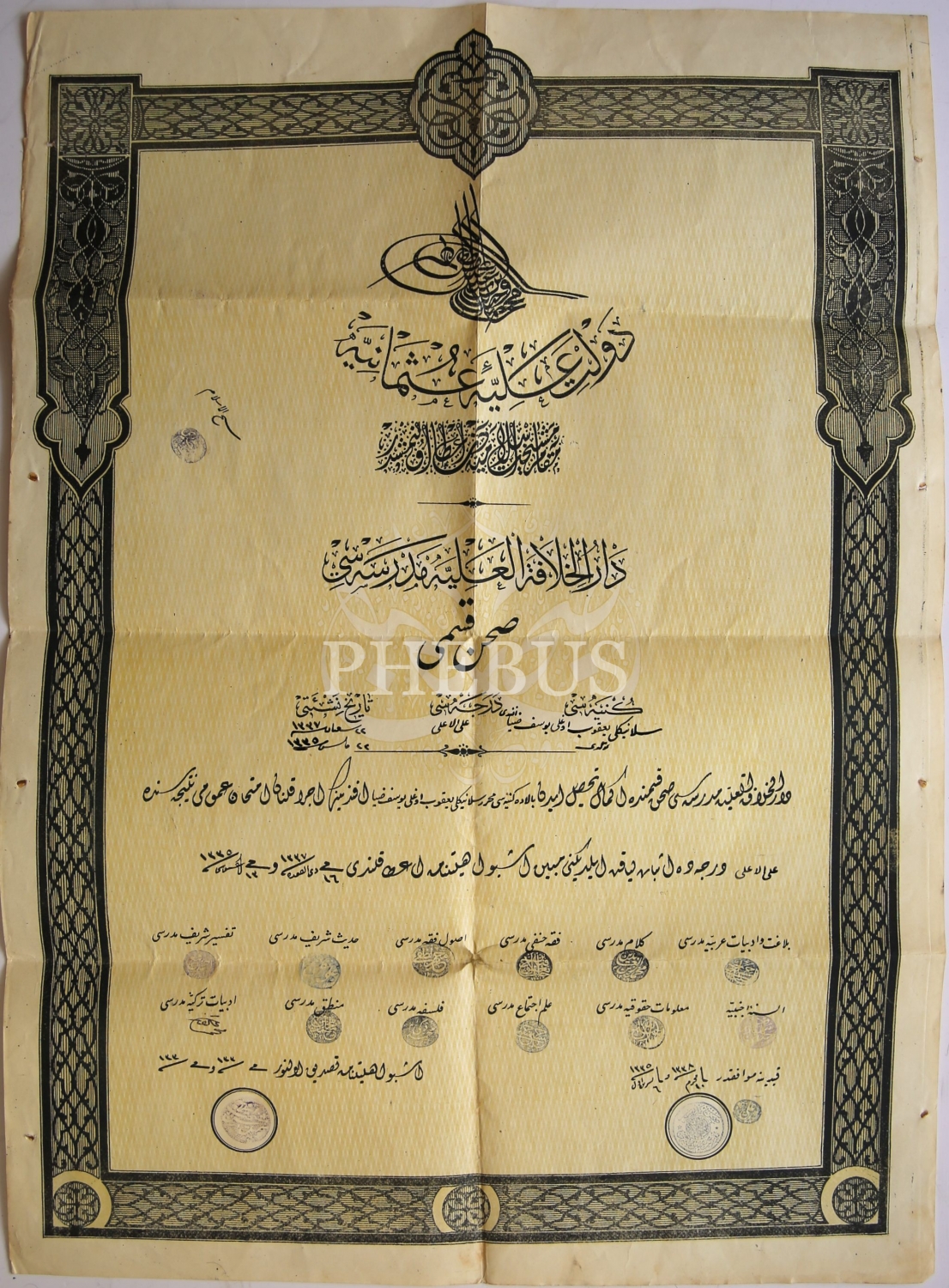 Mehmed Akif [Ersoy] ıslak imzalı Darü'l-hilafeti'l Aliyye Medresesi Sahn Kısmı Diploması, Selanikli Yakub Oğlu Yusuf Ziya Efendi'ye ait, 22 Mayıs 1335 tarihli, damgalı ve mühürlü, 41x48 cm