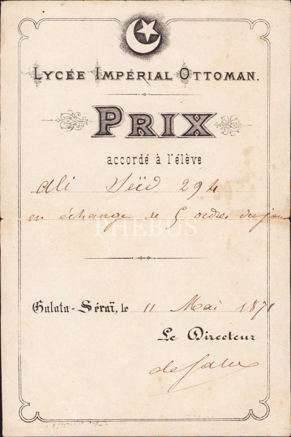 Galatasaray Lisesi Takdir Belgesi, Galatasaray Lisesi'nin İlk Müdürü M de Salve'den imzalı, 1871 tarihli, Fransızca, 10,5x16 cm