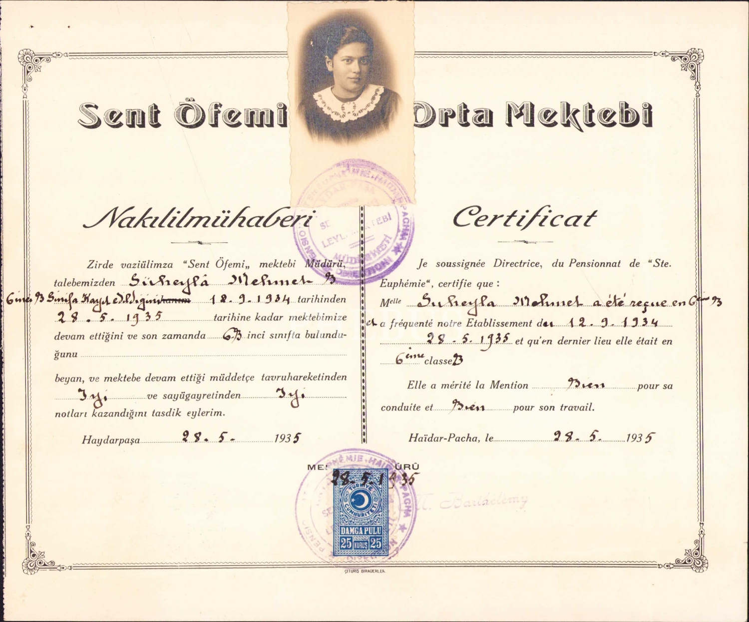 Sent Öfemi Orta Mektebi Nakil İlm ü Haberi, Süheyla Mehmed'e ait, 1935 tarihli, 25x21 cm