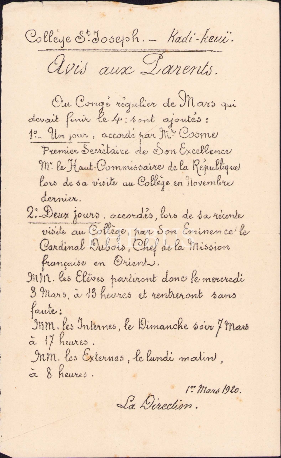 Kadıköy Saint Joseph Ebeveyn Bildirimi, matbu, Fransızca, 1920 tarihli, 13x21 cm