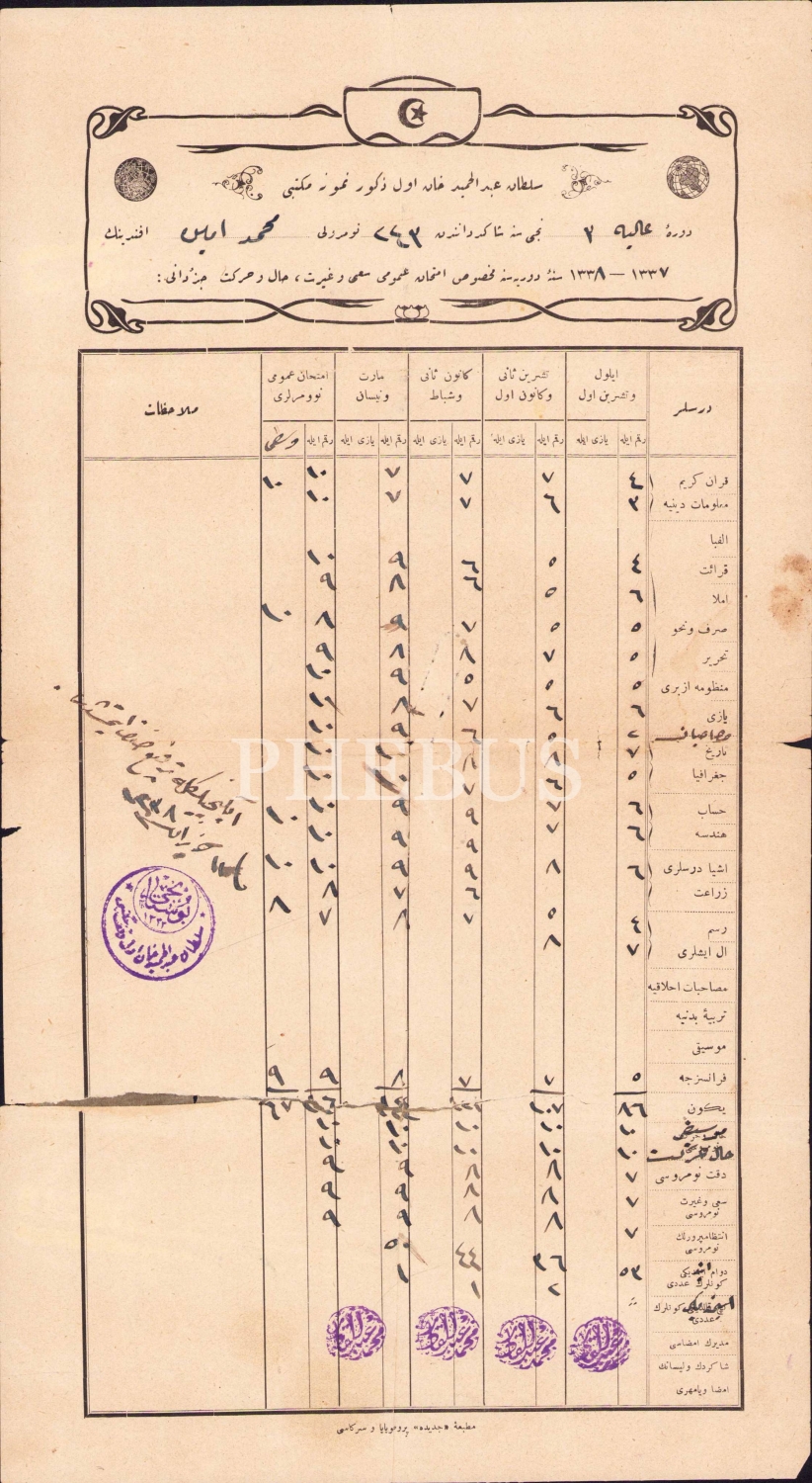 Sultan Abdül Hamid-i Evvel (1. Abdülhamid) Zükur Numune Mektebi Ders Cedveli, 1337 tarihli, Mehmed Emin Efendi'ye ait, tamirli haliyle, 21x38 cm