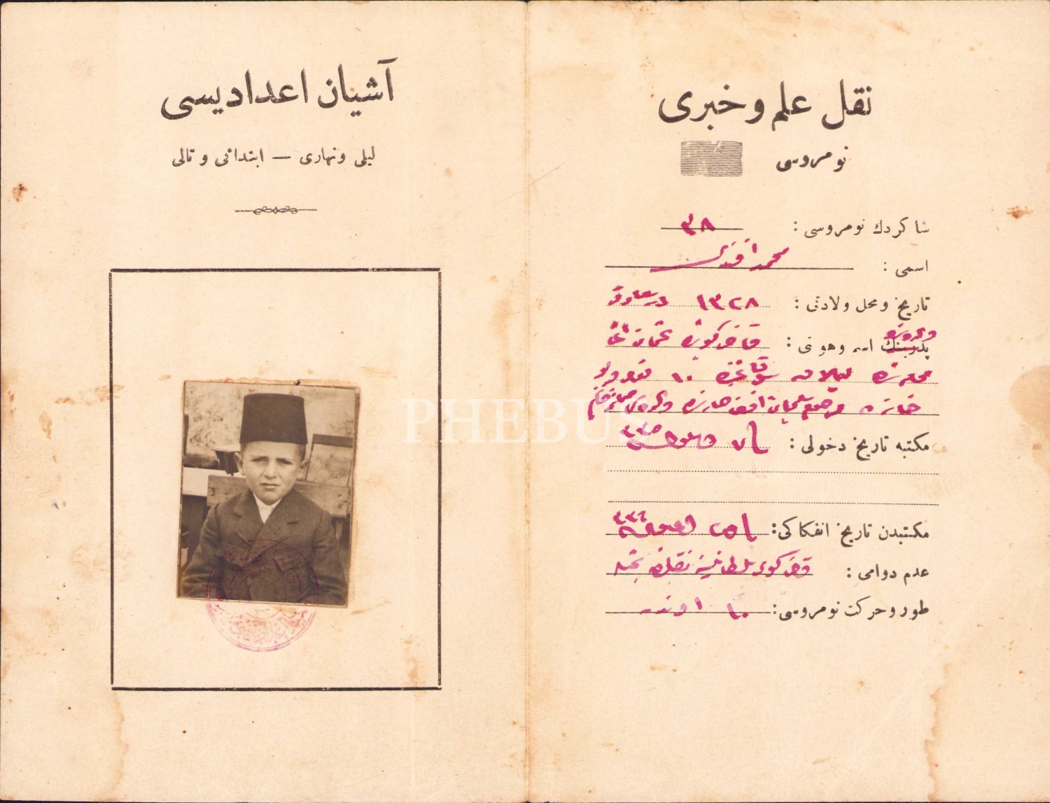 Aşiyan İdadisi'ne Talebe Nakil Kimliği, Mehmed Efendi'ye ait, Osmanlıca, 1336 tarihli, 3 sayfa, 11x17,5 cm