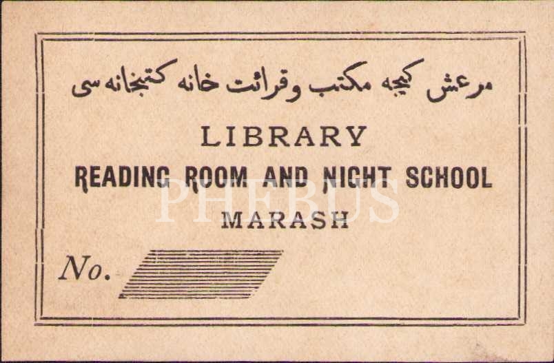 Maraş Gece Mekteb ve Kıraathane Kütüphanesi fişi, Library Reading Room and Night School Marash, Osmanlıca ve İngilizce, 7x4,5 cm