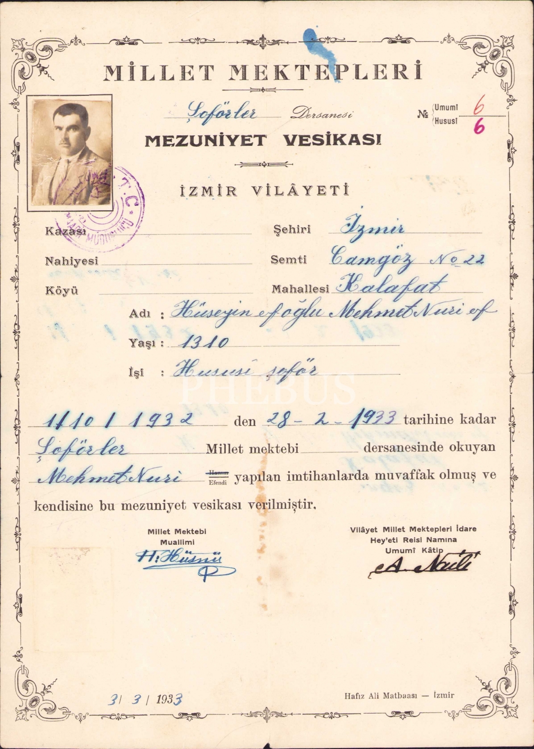 Millet Mektepleri Şoförler Dersanesi Mezuniyet Vesikası, İzmir Vilayeti, Mehmed Nuri Efendi'ye ait, 1933 tarihli, 20,5x29 cm