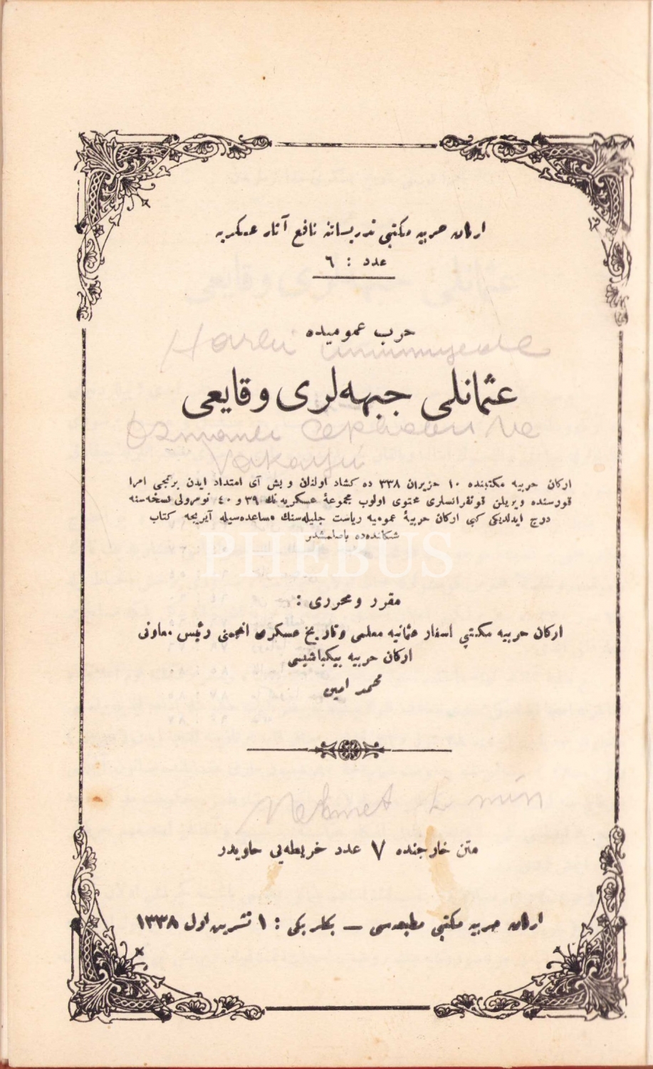 Osmanlı Cepheleri Vakayi, Mehmed Emin, Erkan-ı Harbiye Mekteb-i Matbaası, 1338, Osmanlıca, 90 sayfa, 16x24 cm