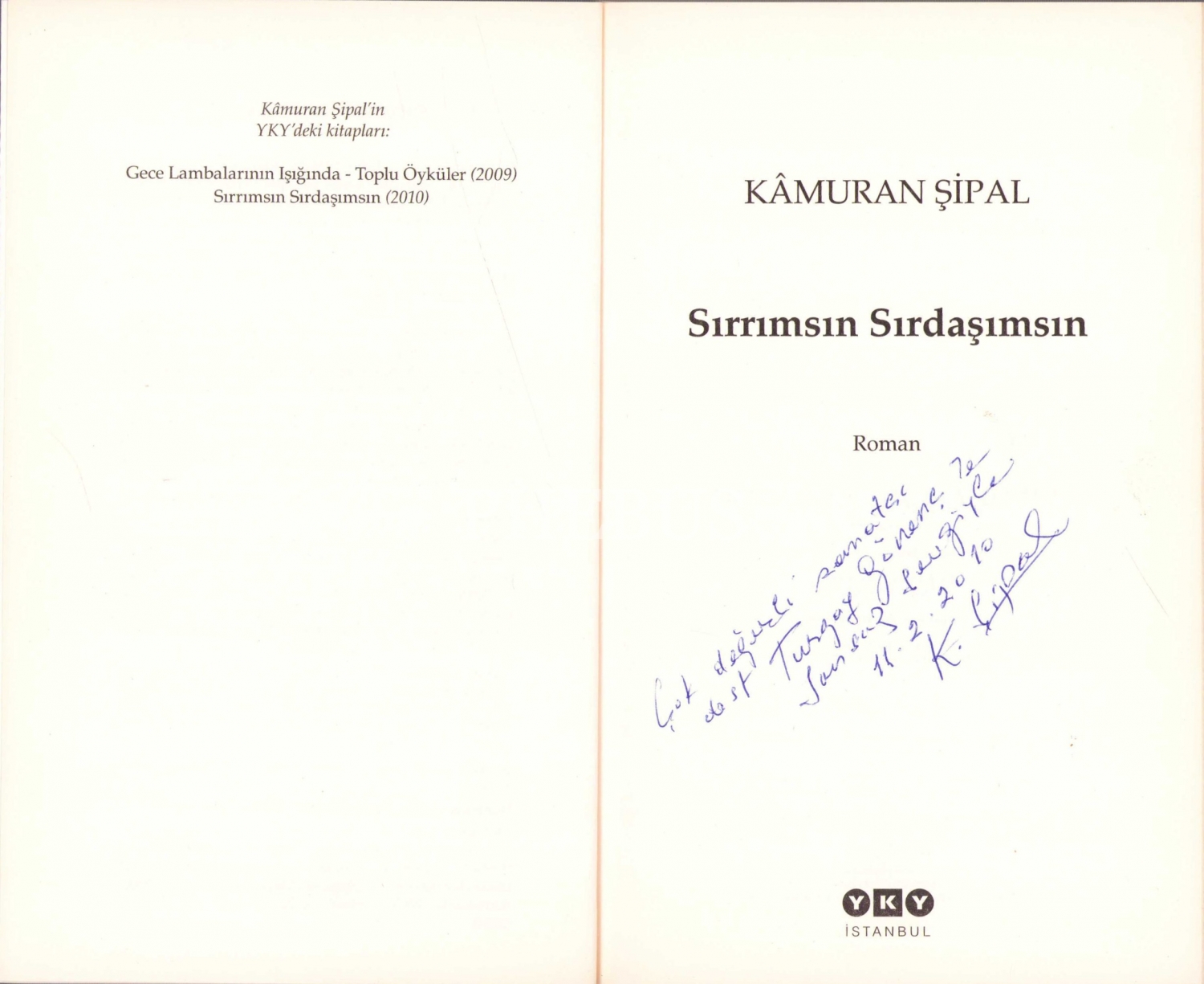 Sırrımsın Sırdaşımsın, Kamuran Şipal, YKY, İstanbul, 2010, yazarından Turgay Gönenç'e ithaflı imzalı, 279 sayfa, 12x19 cm