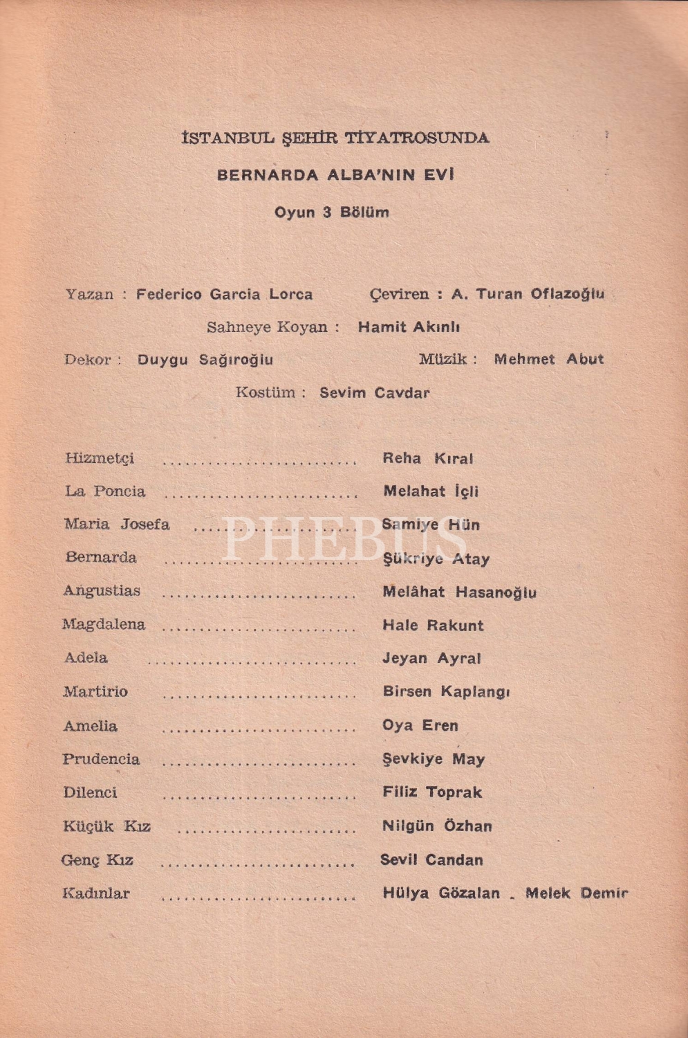 Bernarda Alba'nın Evi - oyun, Federico Garcia, çev., A. Turan Oflazoğlu, İstanbul, 62 sayfa, 12x18 cm