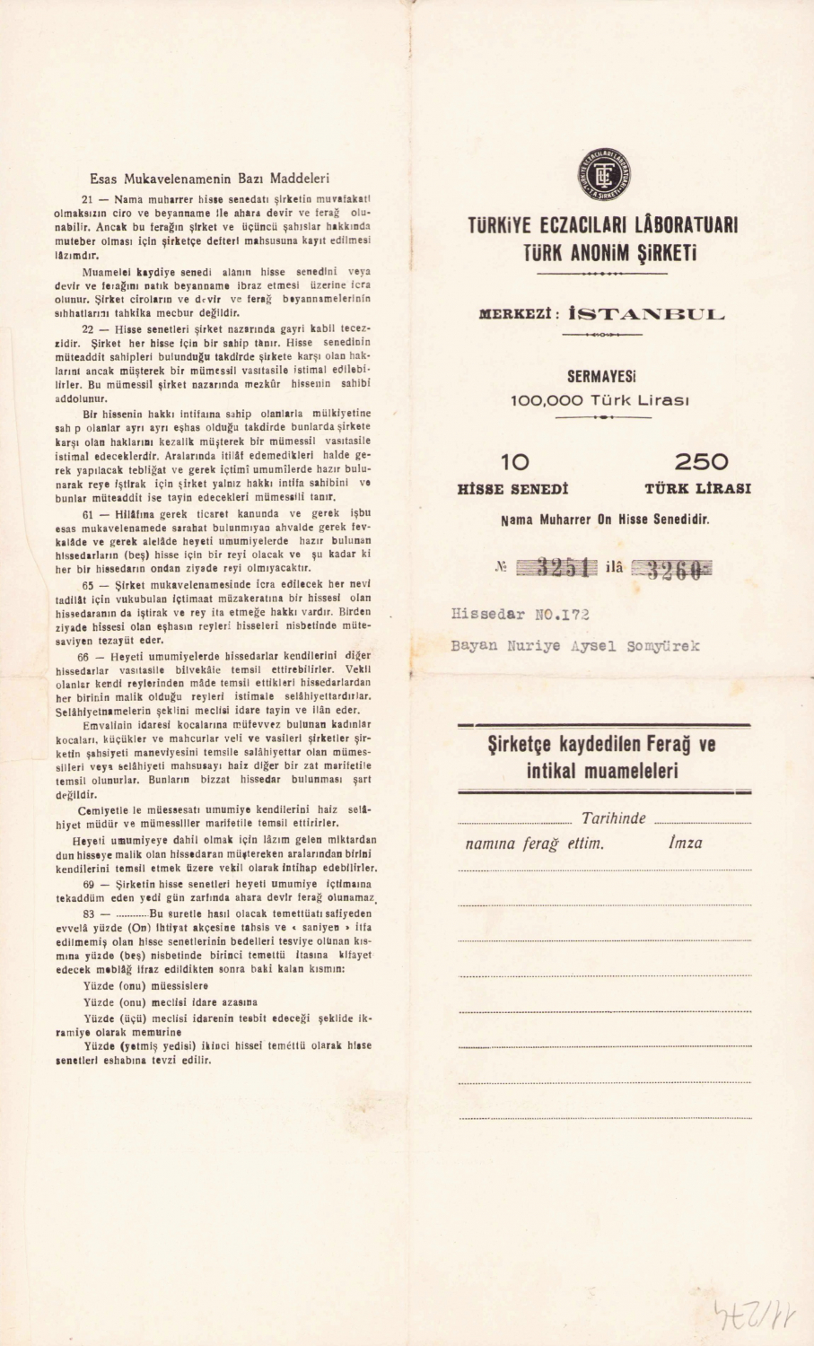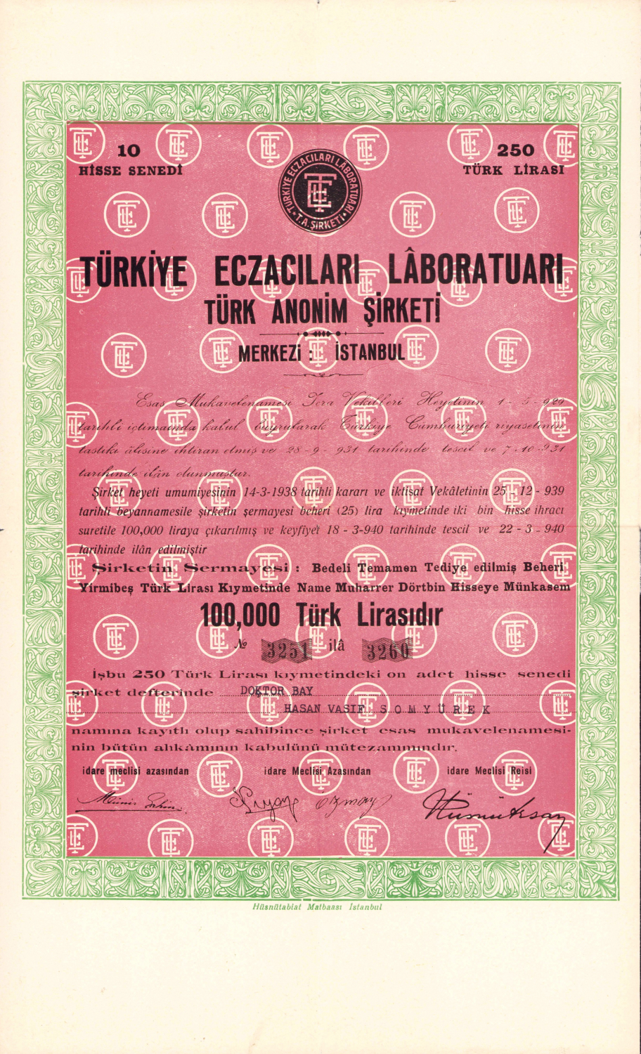 Türkiye Eczacıları Laboratuarı Türk Anonim Şirketi hisse senedi, İstanbul, 22x37cm