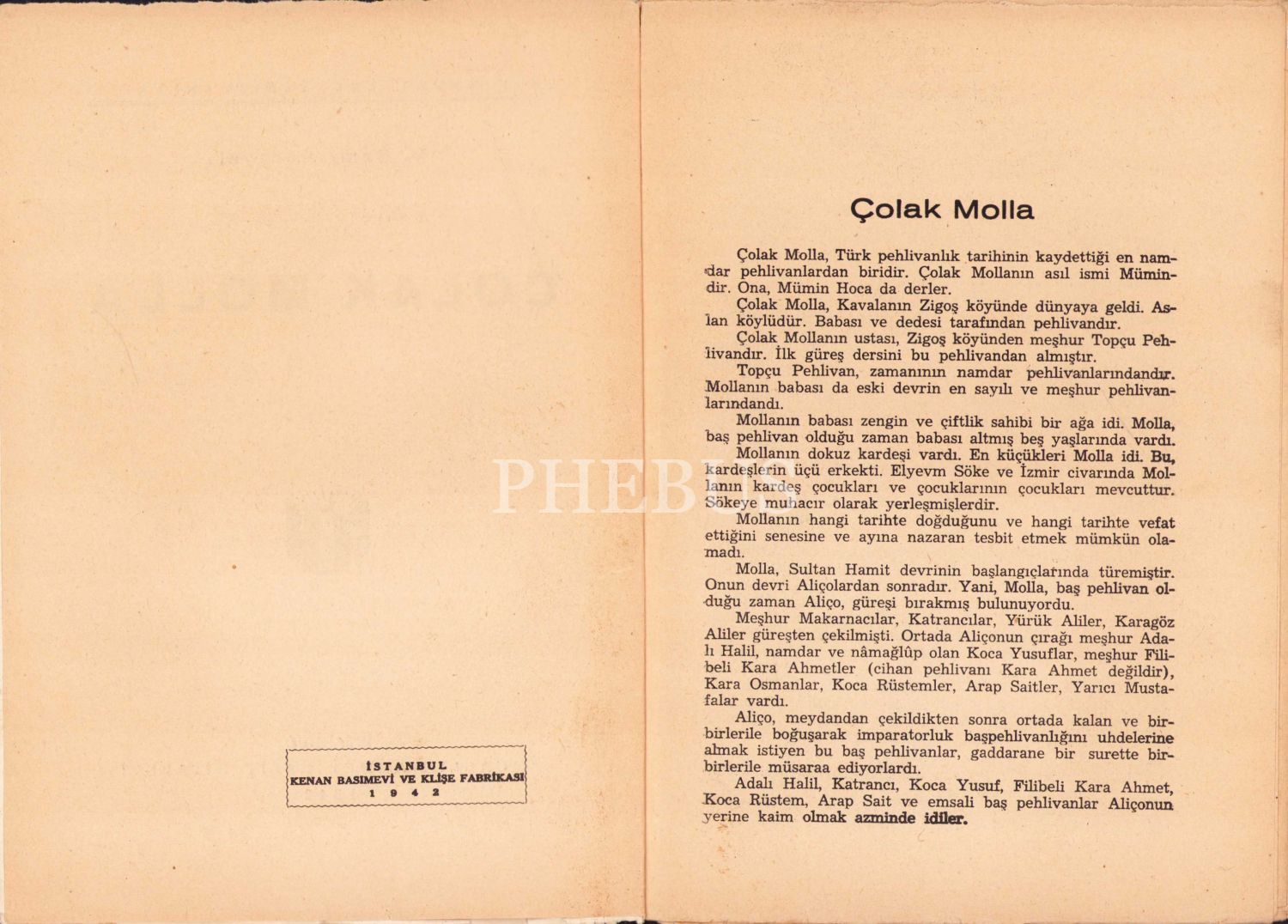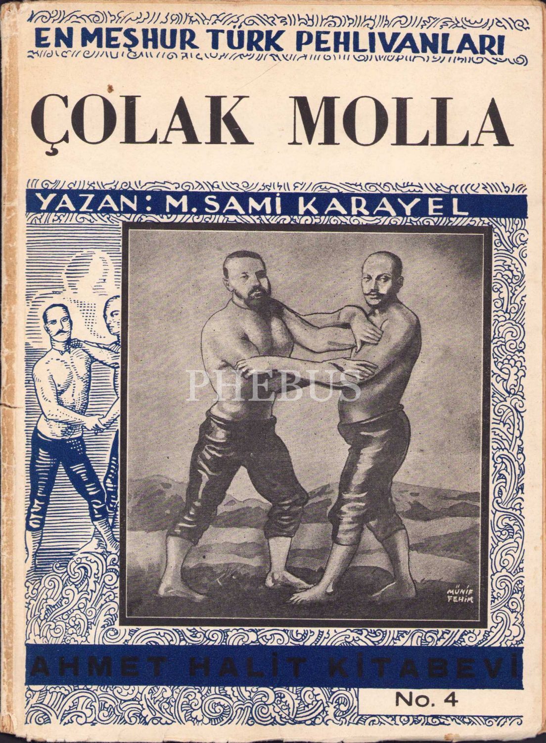 En Meşhur Türk Pehlivanları: 4 - Çolak Molla, M. Sami Karayel, Ahmet Halit Kitabevi, Kenan Matbaası, İstanbul, 1942, Münif Fehim kapak, 54 sayfa, 14x22 cm