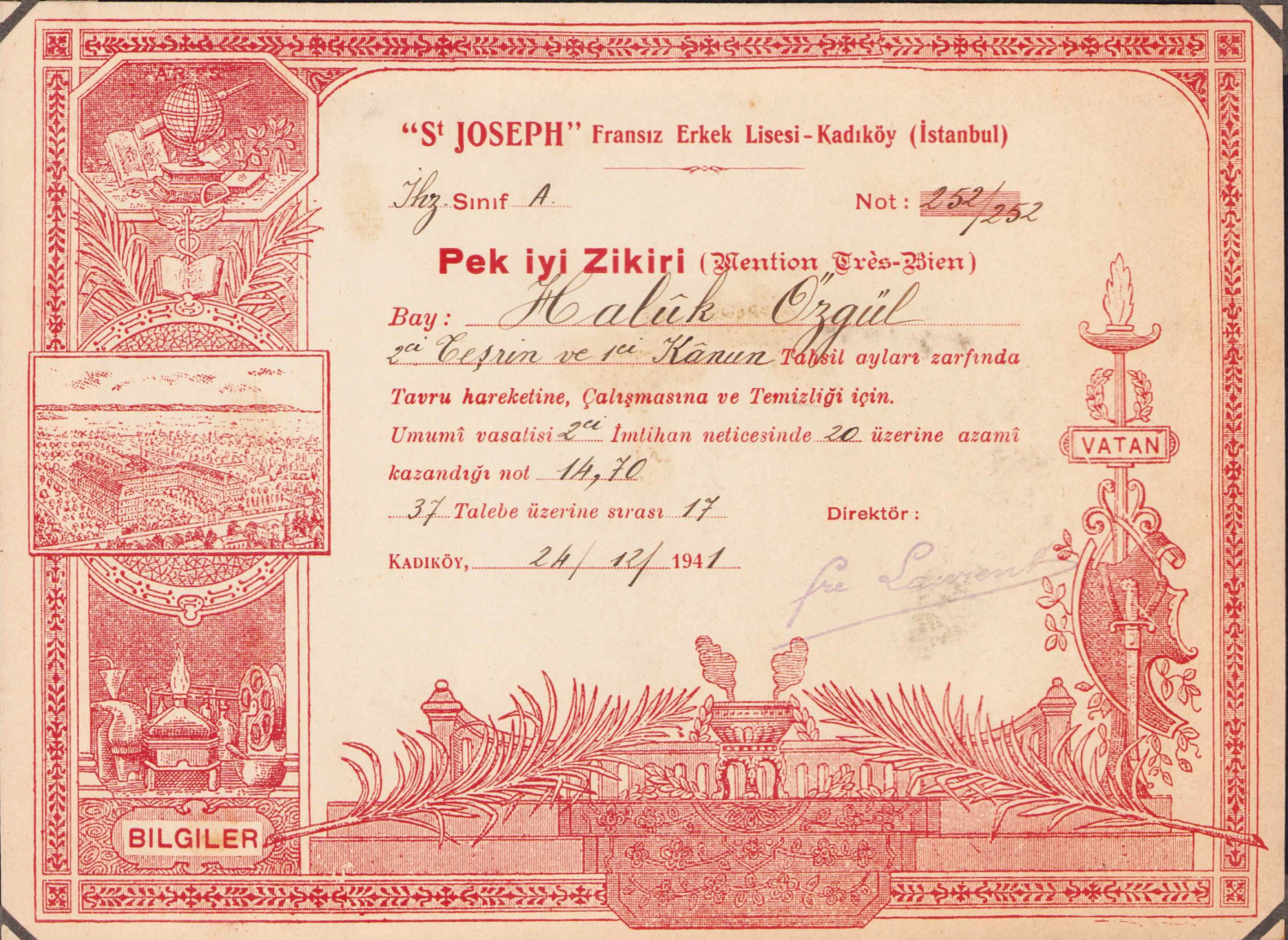St. Joseph Fransız Erkek Lisesi pek iyi zikiri, 1941 tarihli, 23x16cm