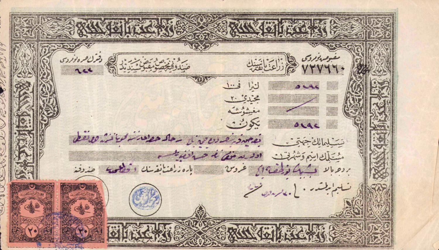 Ziraat Bankasının sendikaya mahsus makbuz senedi, 1340 tarihli, mühürlü pullu, 23x13cm