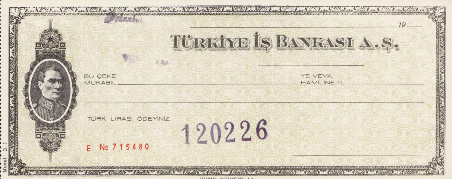 Atatürk görselli Türkiye İş Bankası çeki, 22x9cm