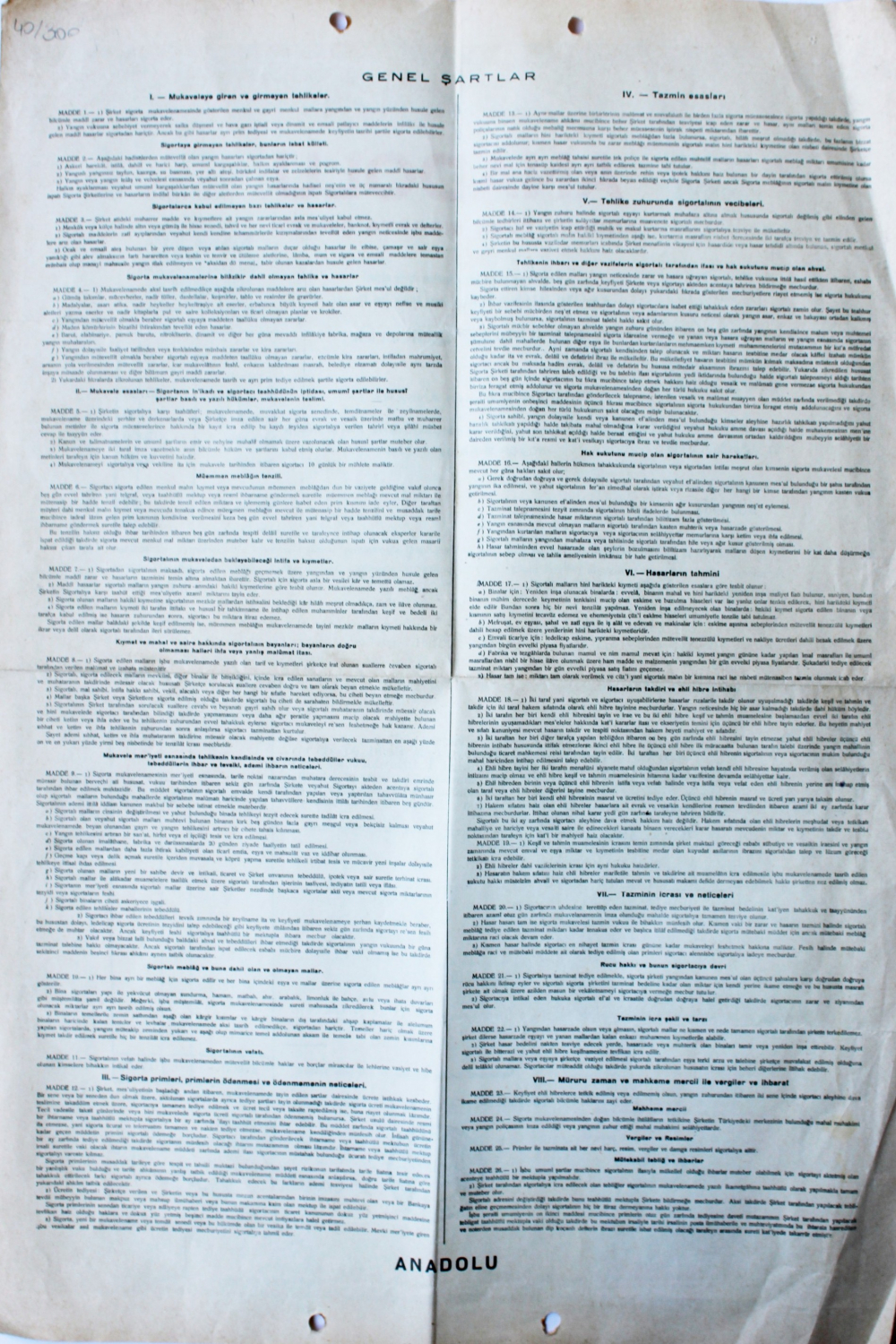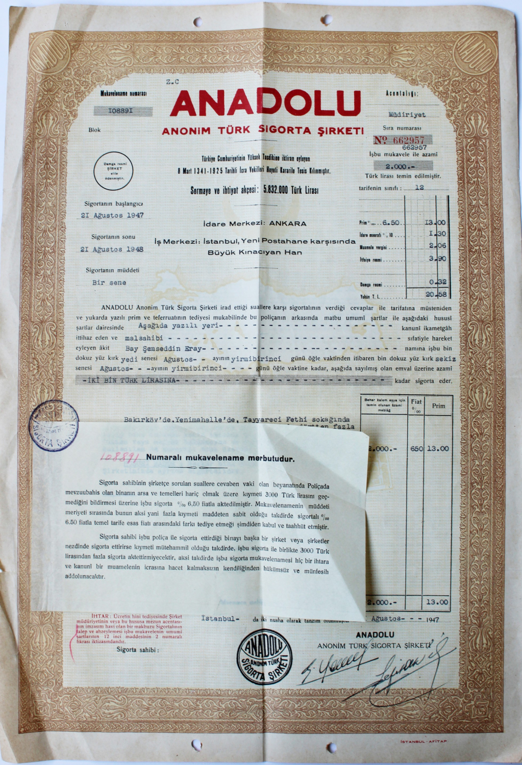 Anadolu Sigorta Poliçesi, büyük ebat 31x46cm
