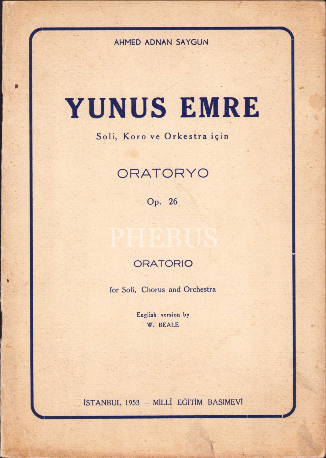 Yunus Emre Solo Koro ve Orkestra İçin Oratoryo, Ahmed Adnan Saygun'dan imzalı ve ithaflı, İstanbul, 1953, Milli Eğitim Basımevi, 15 sayfa.