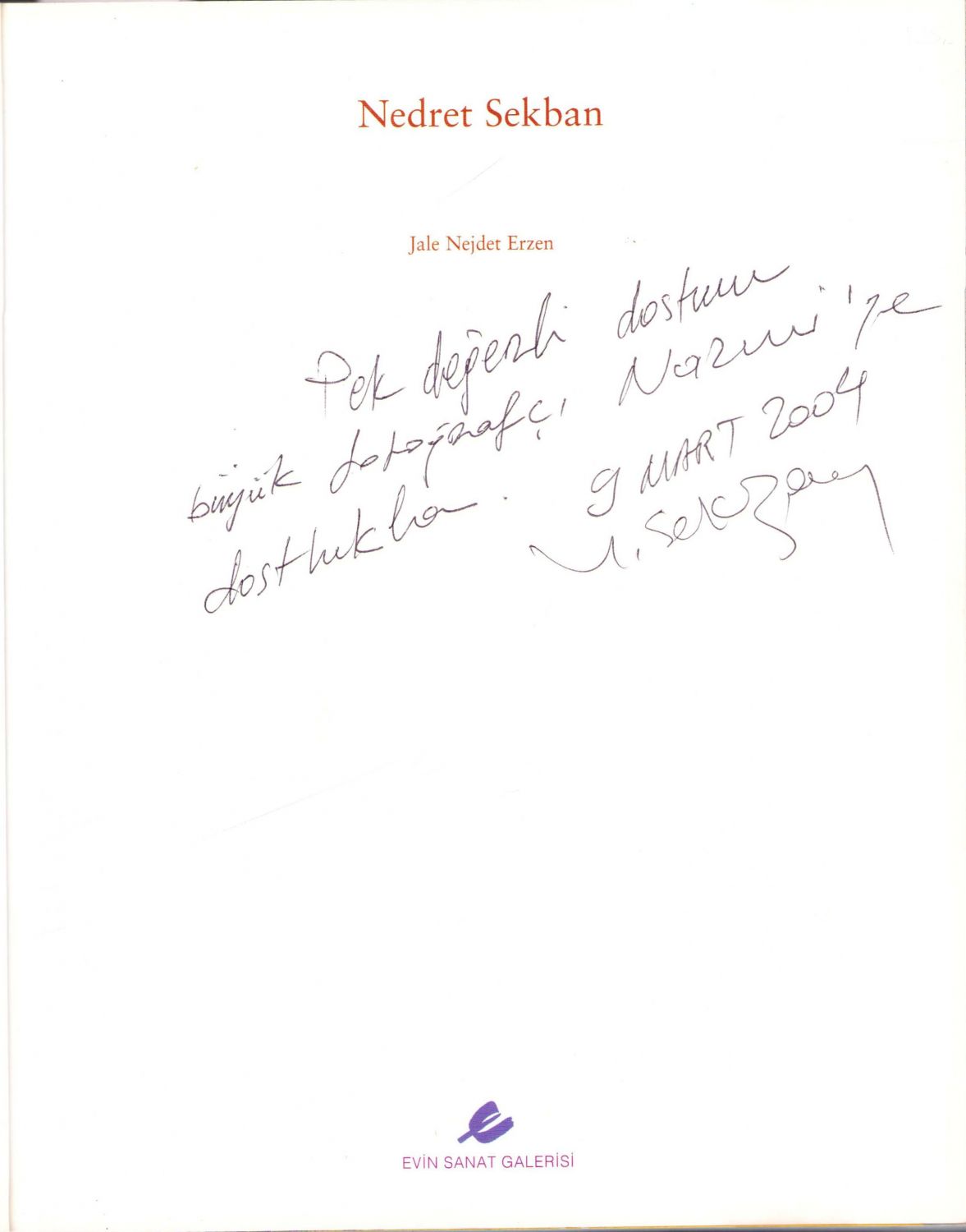 Nedret Sekban, Jale Nejdet Erzen, Evin Sanat Galerileri, Nejdet Sekban'dan imzalı ve ithaflı, Ekim 2001.