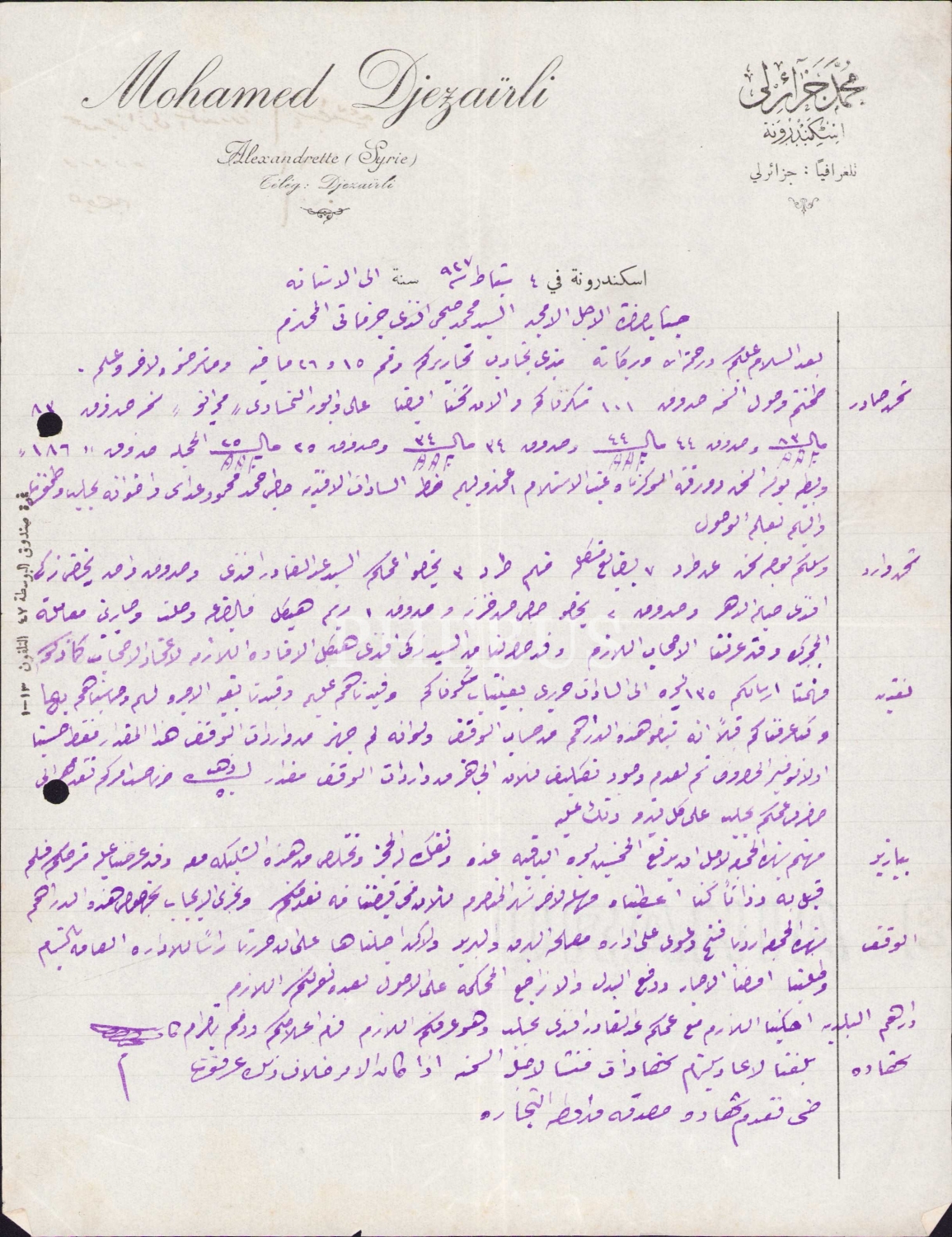 Osmanlıca, Fransızca Muhammed Cezairli, İskenderun antetli Osmanlıca doküman, 1927, 20x26 cm