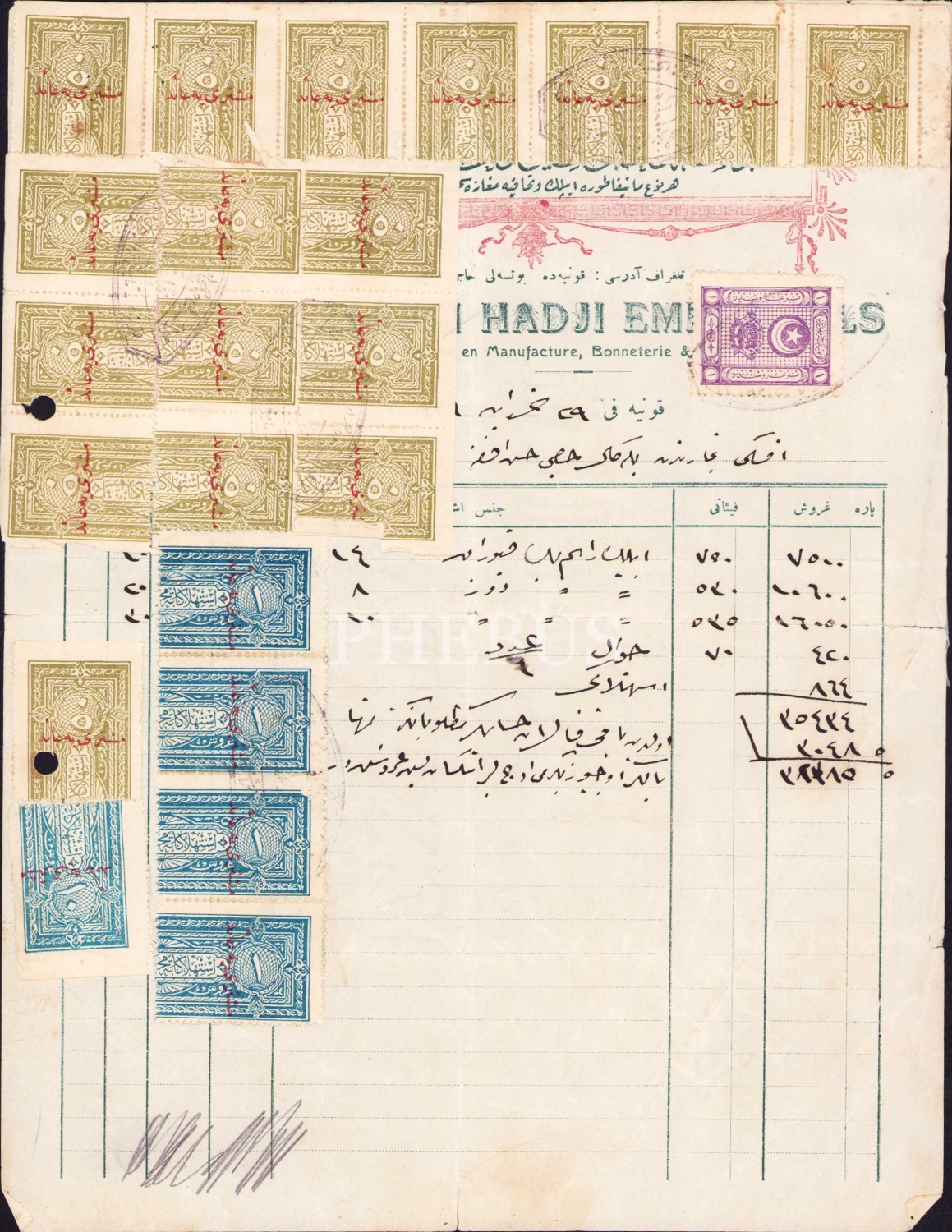 Osmanlıca Fransızca Botsalı Zade Hacı Emin Ve Mahdumları Manifatura, Konya antetli fatura, bol pullu, 20x28 cm