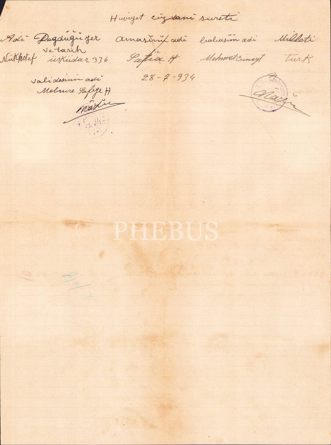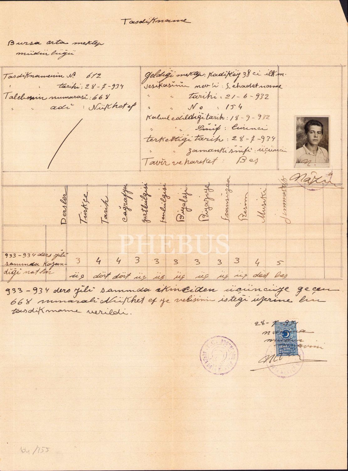 Bursa Orta Mektebi talebesine ait tasdikname, 1934, 30x40 cm