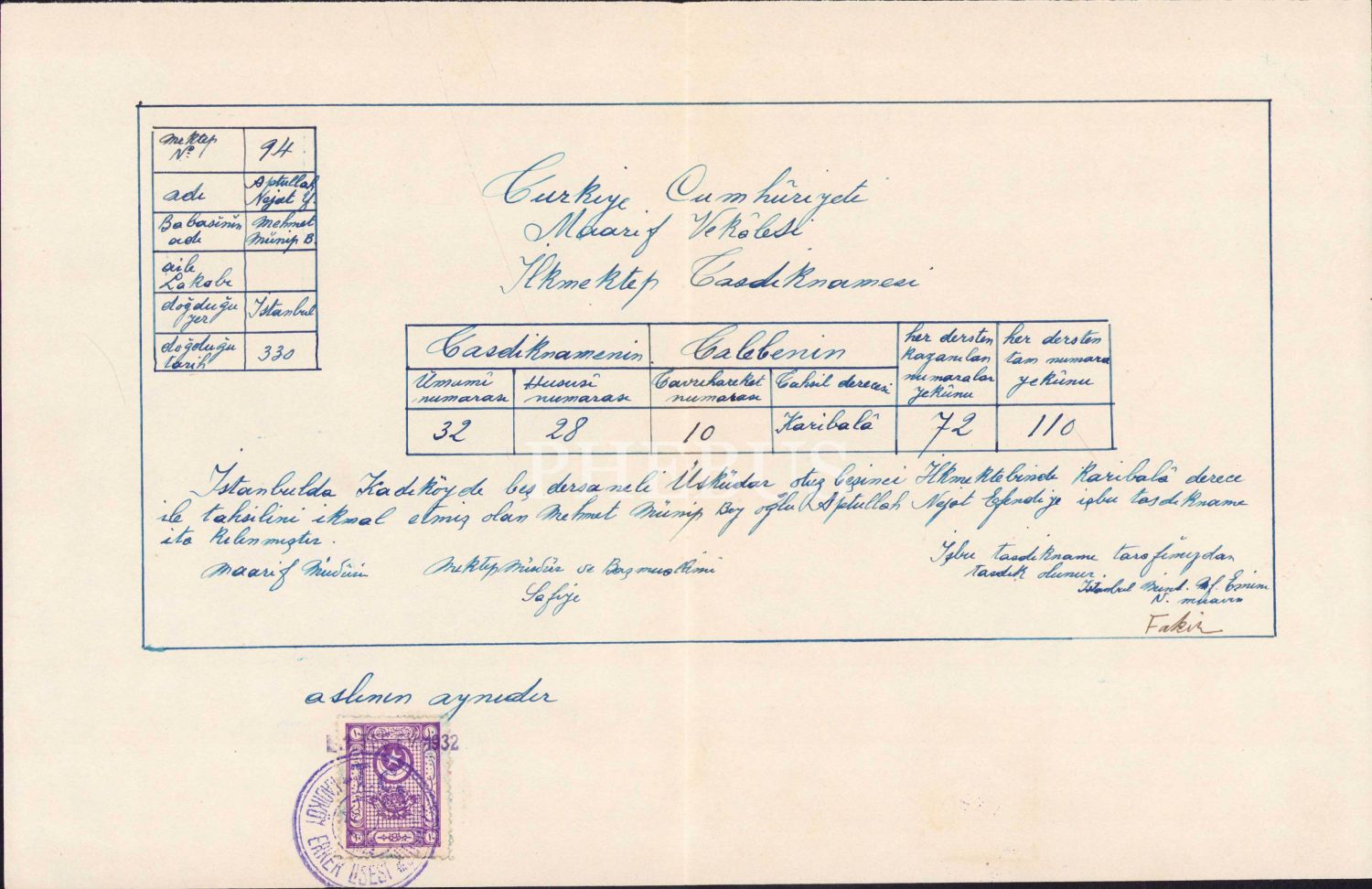 Türkiye Cumhuriyeti Maarif Vekaleti İlk Mektep tasdiknamesi, 1932, 31x20 cm