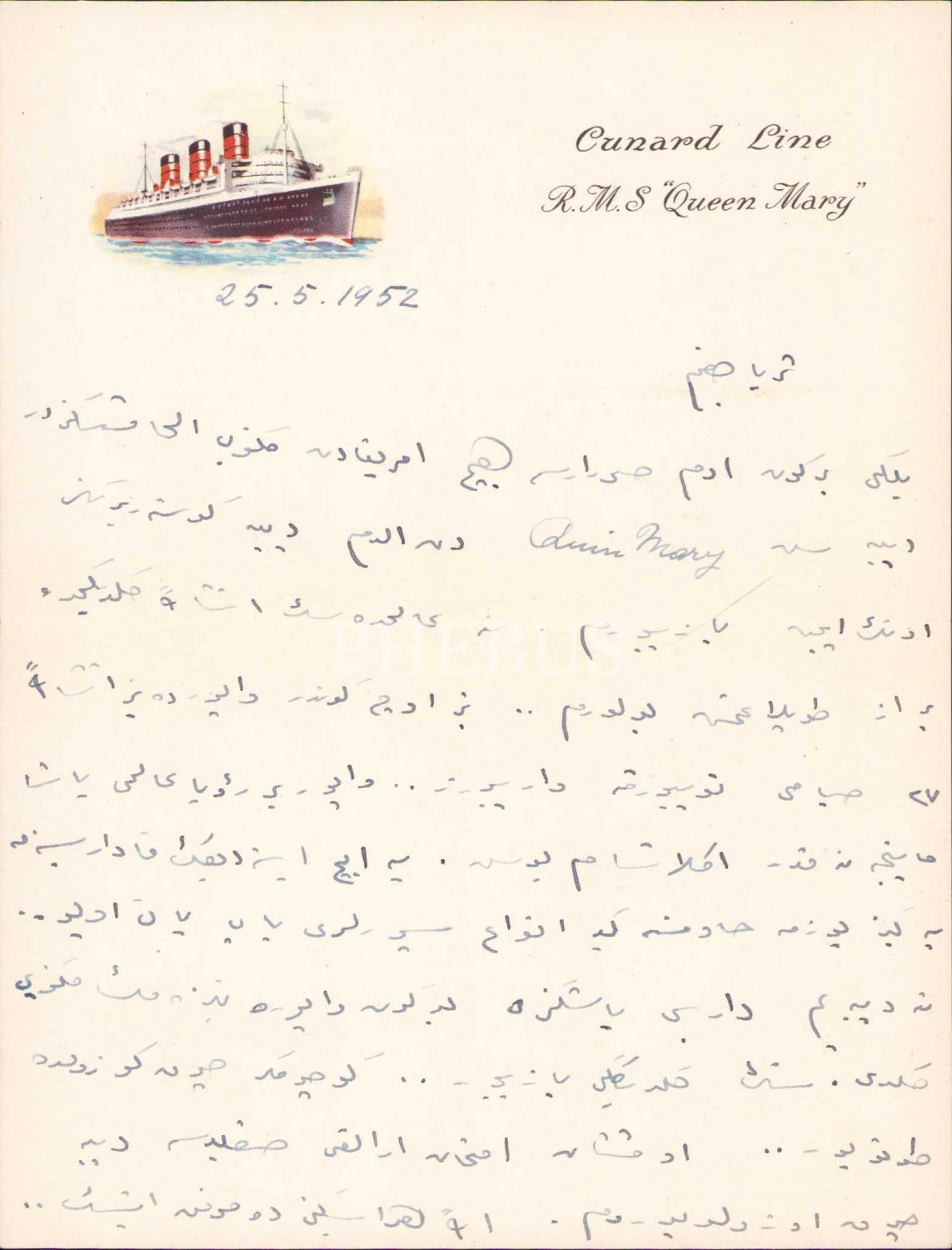Cunard Line R. M. S. Queen Mary antetli Osmanlıca yazılı doküman, 1952, 13x16 cm