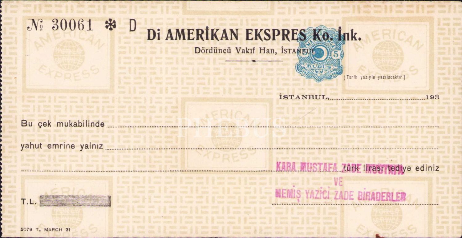 Di Amerikan Ekspres Ko İnk. çek, Dördüncü Vakıf Han, İstanbul, Kara Mustafa Zade Mustafa ve Memiş Yazıcı Zade Biraderler damgalı, 16x8 cm
