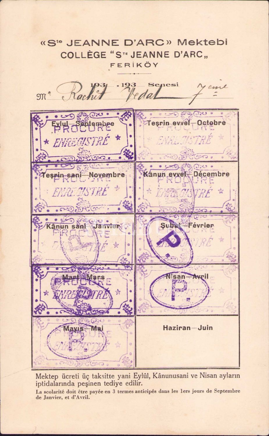 Ste Jeanne D'arc Mektebi, Feriköy taksit ödeme makbuzu, 14x22 cm
