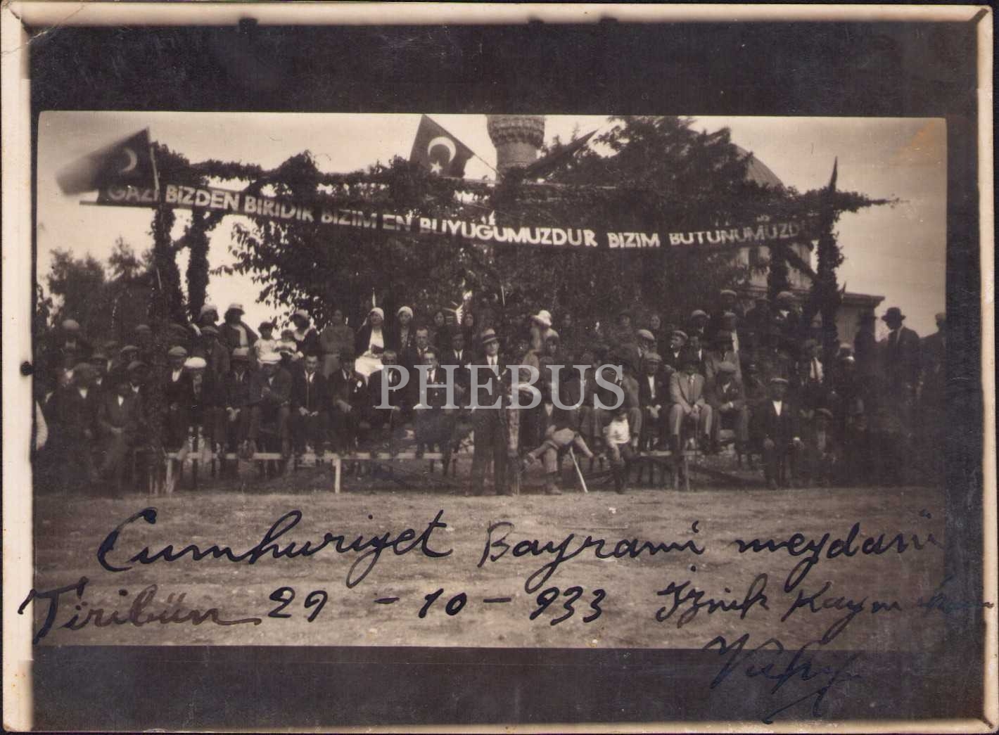Cumhuriyet Bayramı Kutlamaları, İznik, 29. 10. 1933, "Gazi Bizden Biridir Bizim En Büyüğümüzdür, Bizim Bütünümüzdür" pankartlı, 11x8 cm