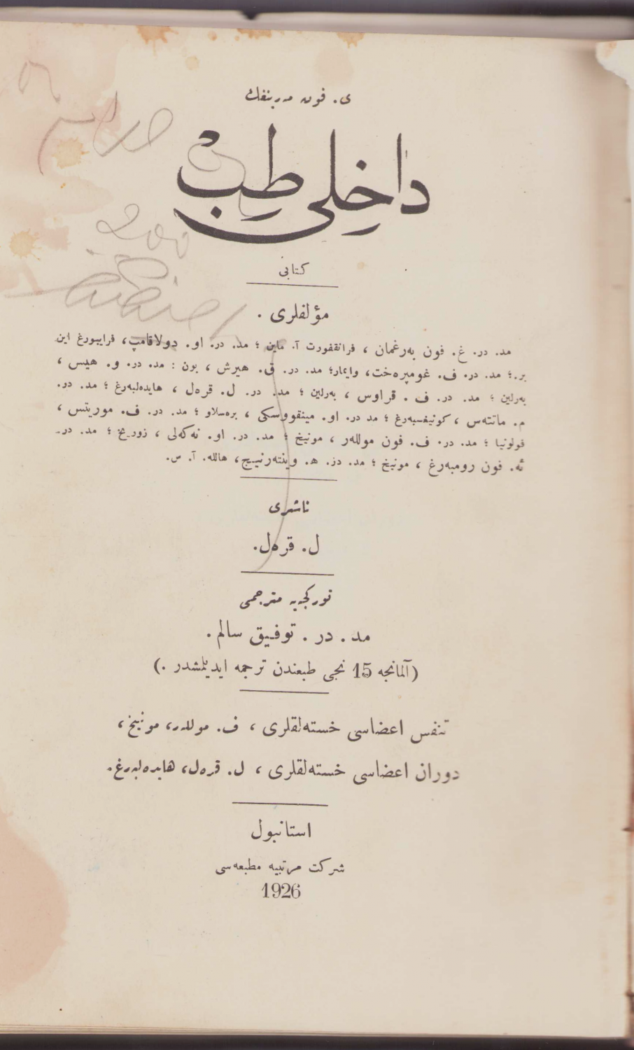 Dahili Tıp, Y. Fon Mering, çev., Doktor Tevfik Salim, Almanca 15. baskıdan çeviri yapılmıştır, Şirket-i Mürettibiye Matbaası, İstanbul, 1926, Osmanlıca, 3 cilt bir arada, resimli şekilli, sırt tarafı kopuk haliyle, deri cilt, 1154 sayfa, 14x24cm