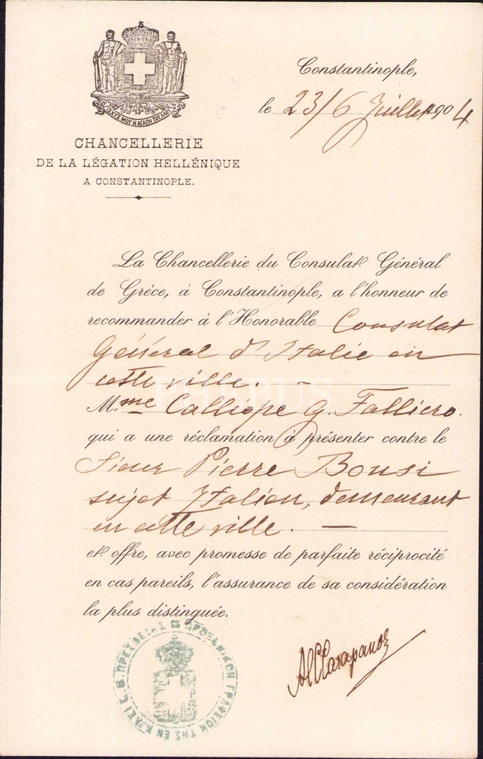 Constantinople, Chancellerie de la Légation Hellénique [Yunan Elçiliği] antetli Fransızca döküman, 1904, 12x19 cm