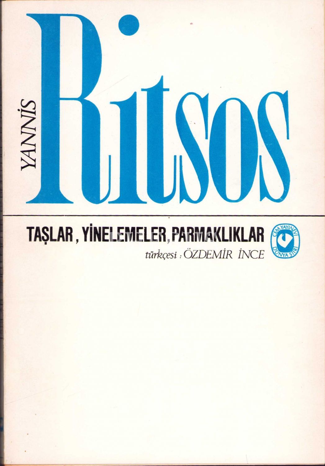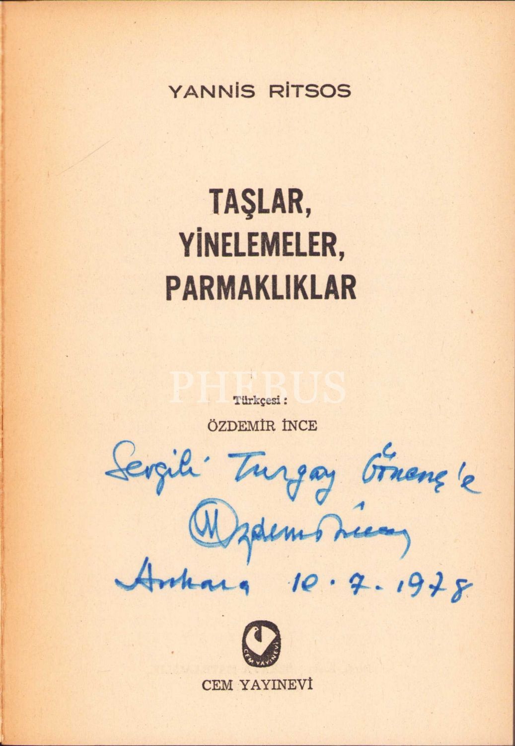 Taşlar, Yinemeler, Parmaklıklar, Yannis Ritsos, çev., Özdemir İnce, İstanbul 1978, İnce'den Turgay Gönenç'eithaflı, imzalı, ilk sayfa kopuk, 115 sayfa, 13x19 cm