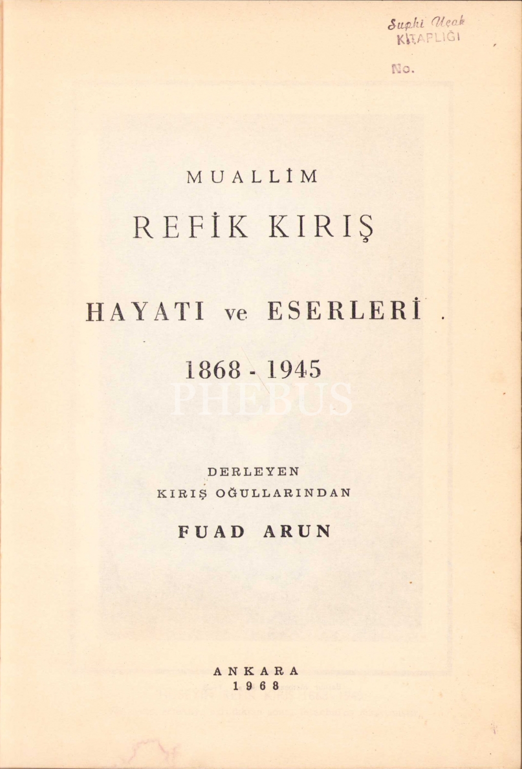 Muallim Refik Kırış Hayatı ve Eserleri [1868 - 1945], derleyen Fuad Arun, Ankara 1968, resimli, 243 sayfa, 16x24 cm