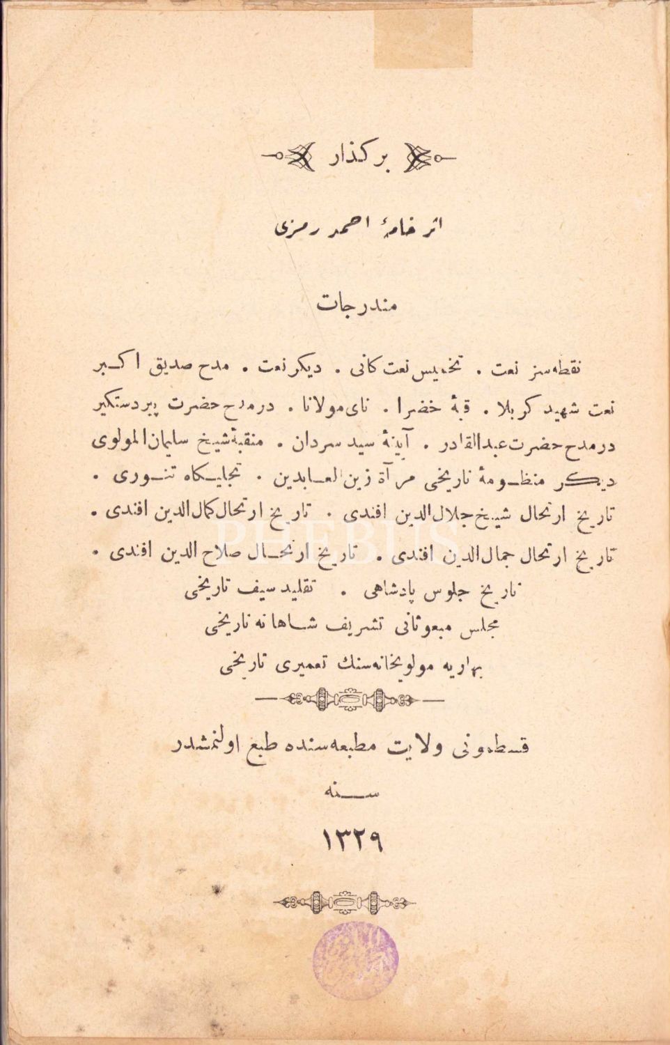 Bergüzar, Ahmed Remzi Mevlevi, Kastamonu Vilayet Matbaası, 1329, sırtı haliyle, 42 sayfa, 13x19 cm, ÖZEGE; 1854