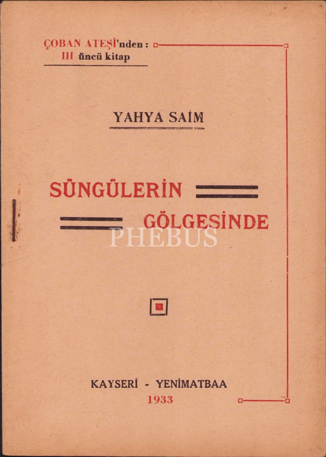 Süngülerin Gölgesinde, Yahya Saim, Kayseri Yeni Matbaa, 1933, 16 sayfa, 13x19 cm
