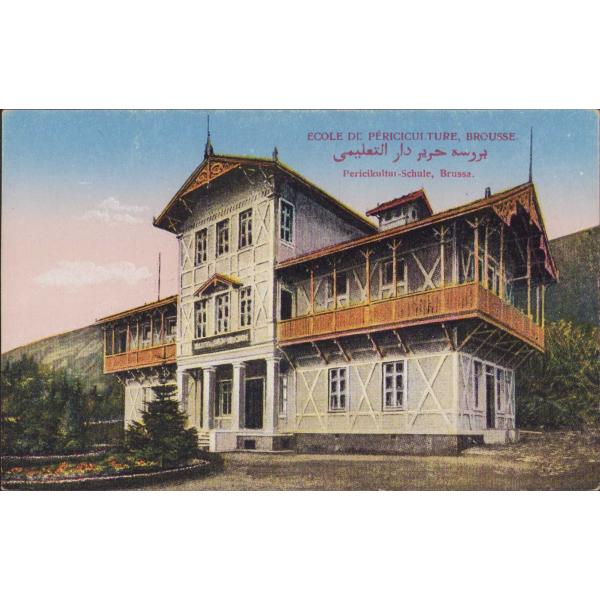Bursa İpekçilik Okulu (Harir Darüttalimi), Fransızca - İngilizce - Osmanlıca yazılı, Yahudi Editör Moise İsraelovitch (MJC) baskısı No:92