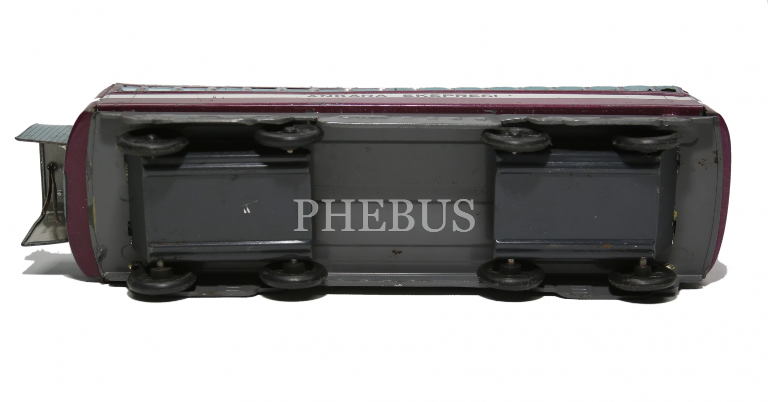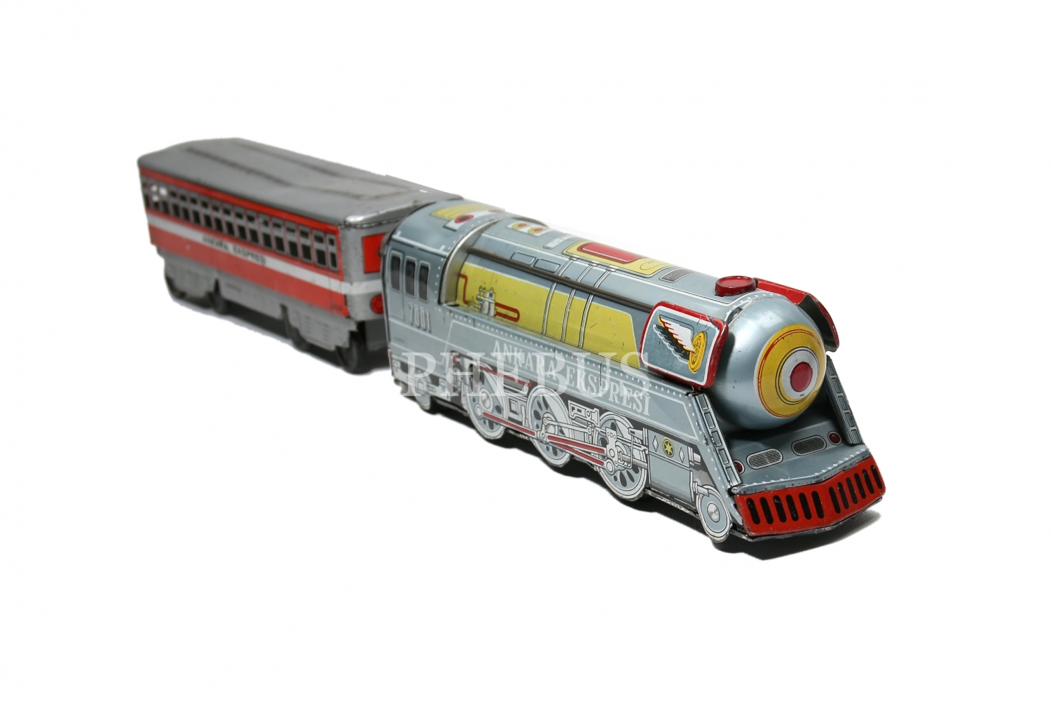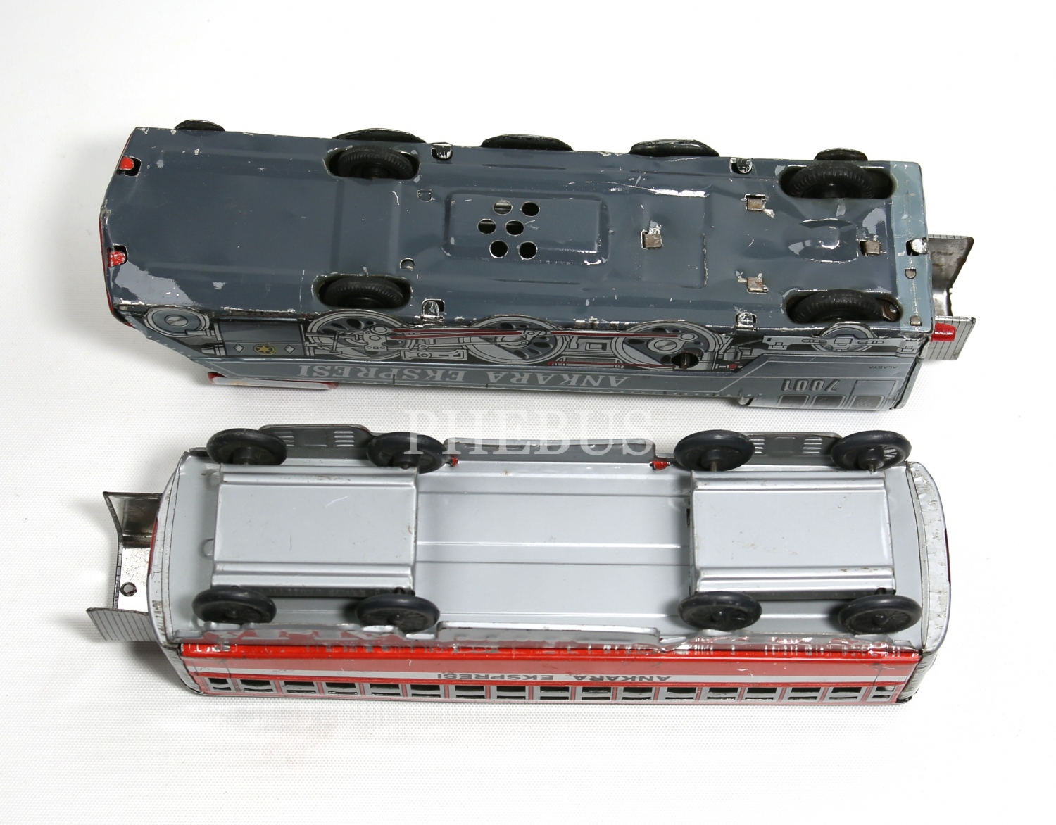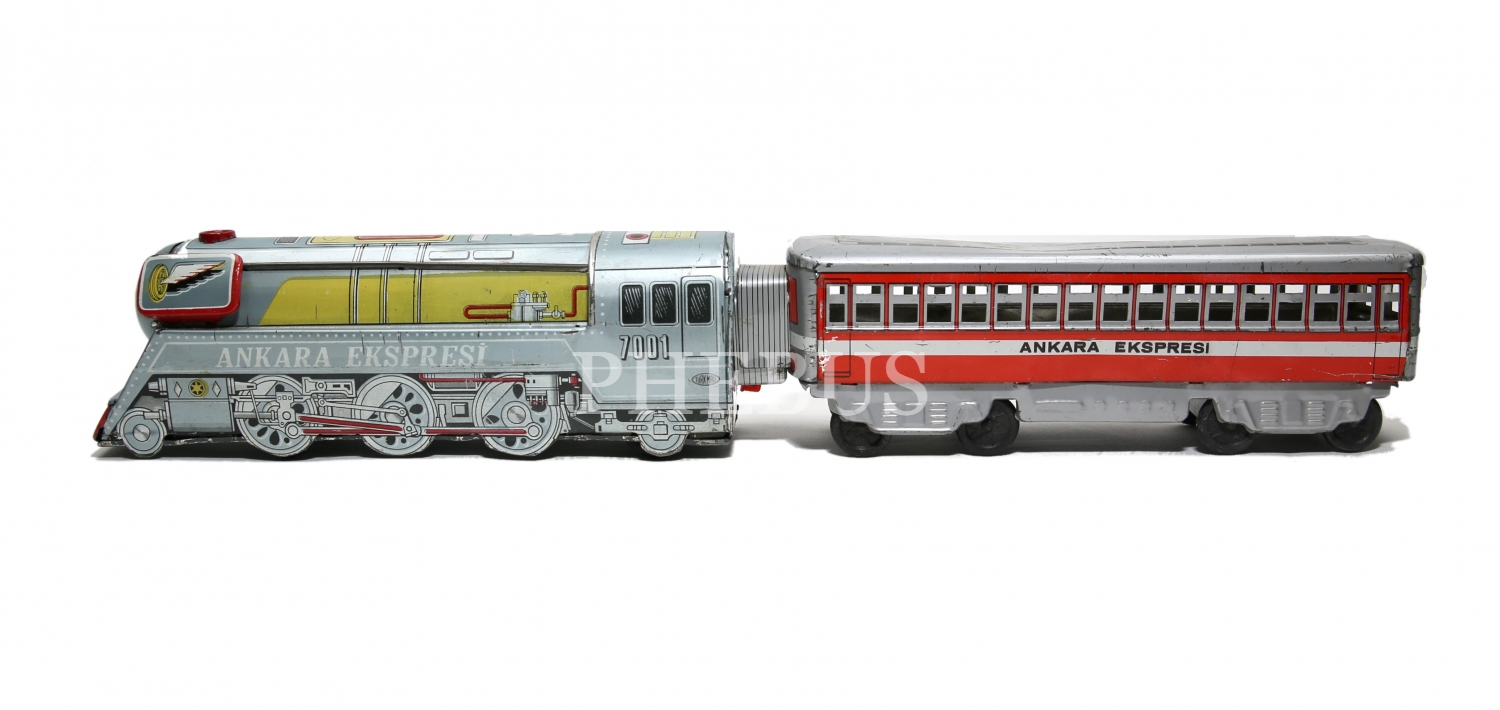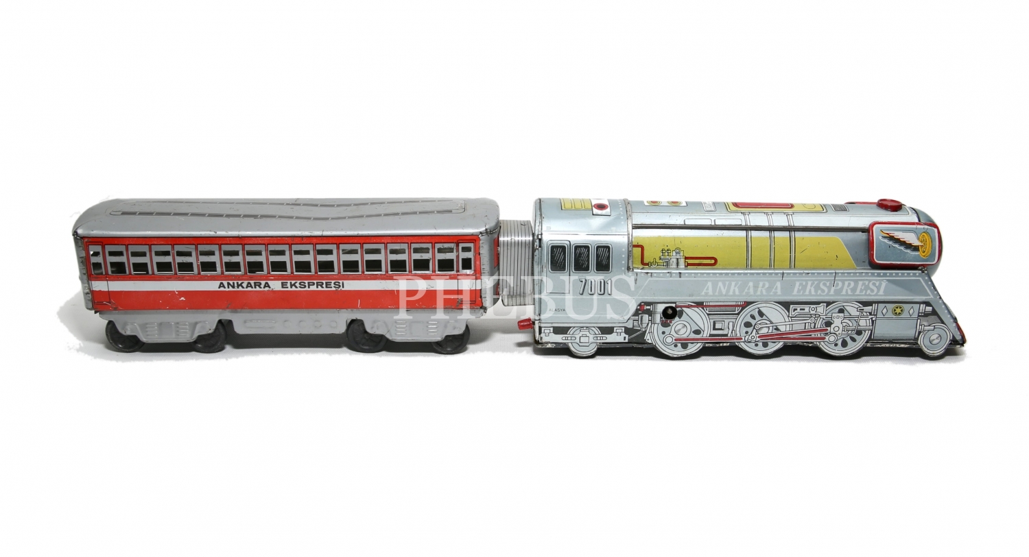 Türk malı, Alasya marka, teneke, kurmalı, 7001 Ankara Ekspresi lokomotifi ve vagonu, 52x7x9 cm
