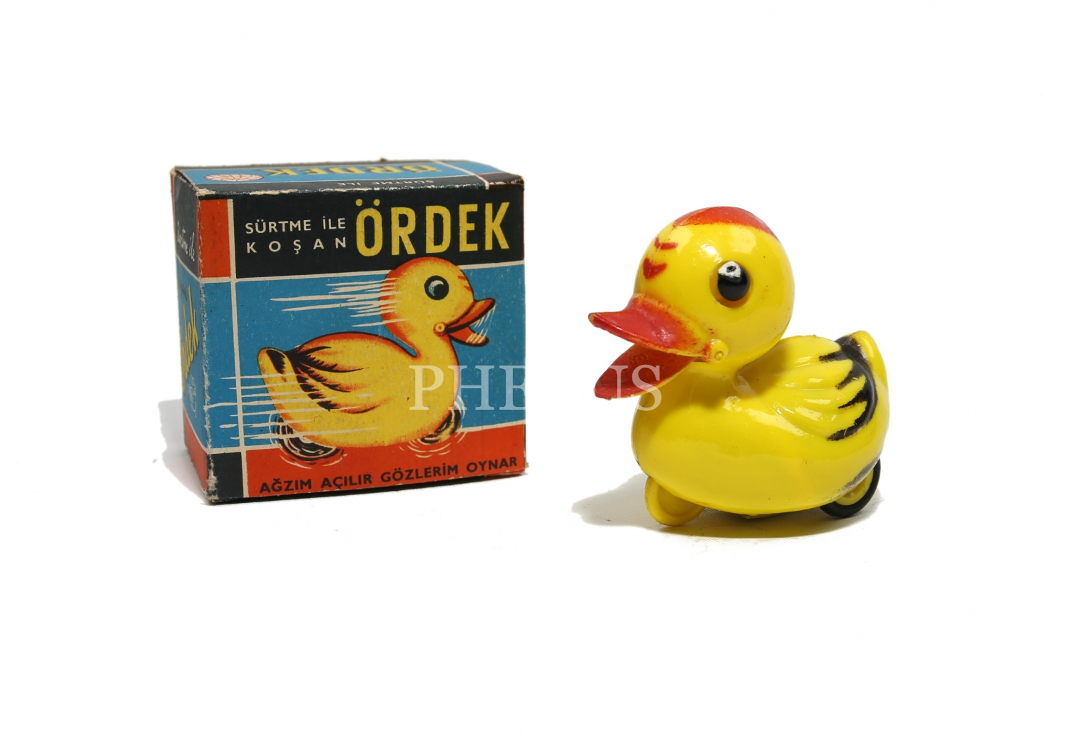 Türk malı, Altın marka, orijinal kutusunda, sürtmeli, plastik oyuncak ördek, 9x7x8 cm