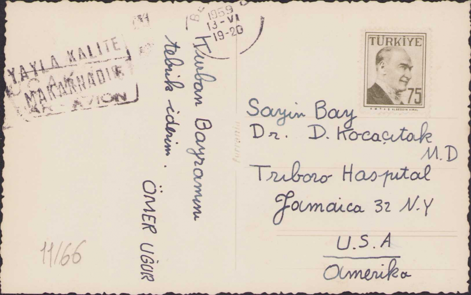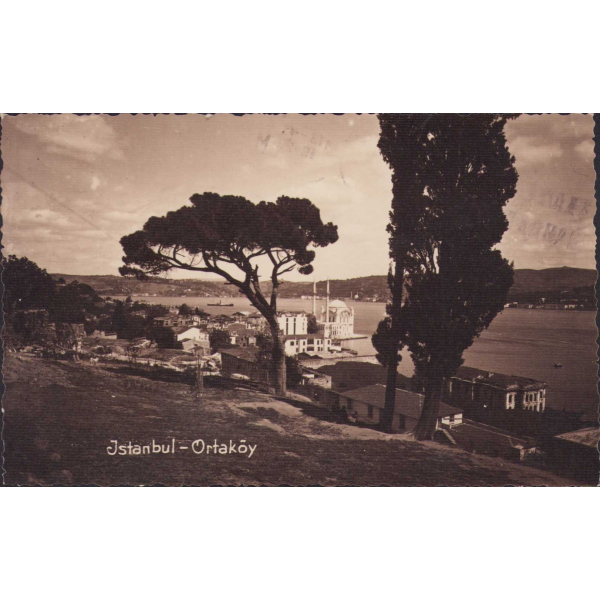 İstanbul Ortaköy ile Ortaköy Camii genel görünümü, arka yüzü bayram tebriği mesajlı, 1959 tarihli, Atatürk pullu, postadan geçmiş, damgalı, Beyoğlu-Newyork adresli