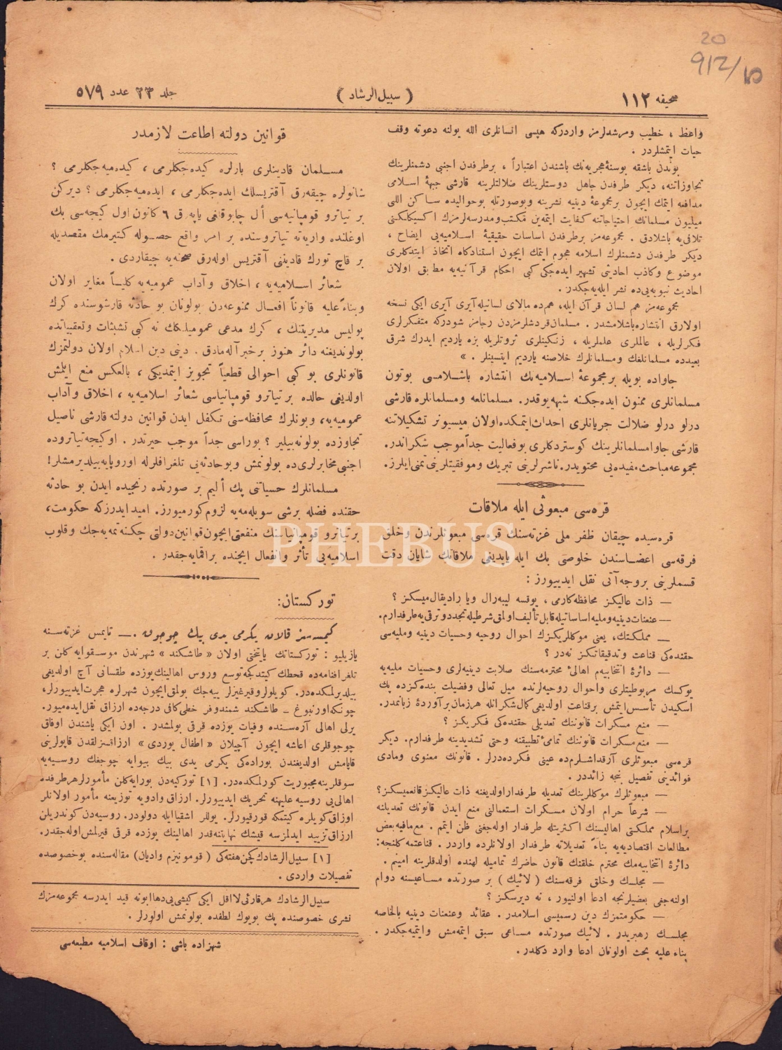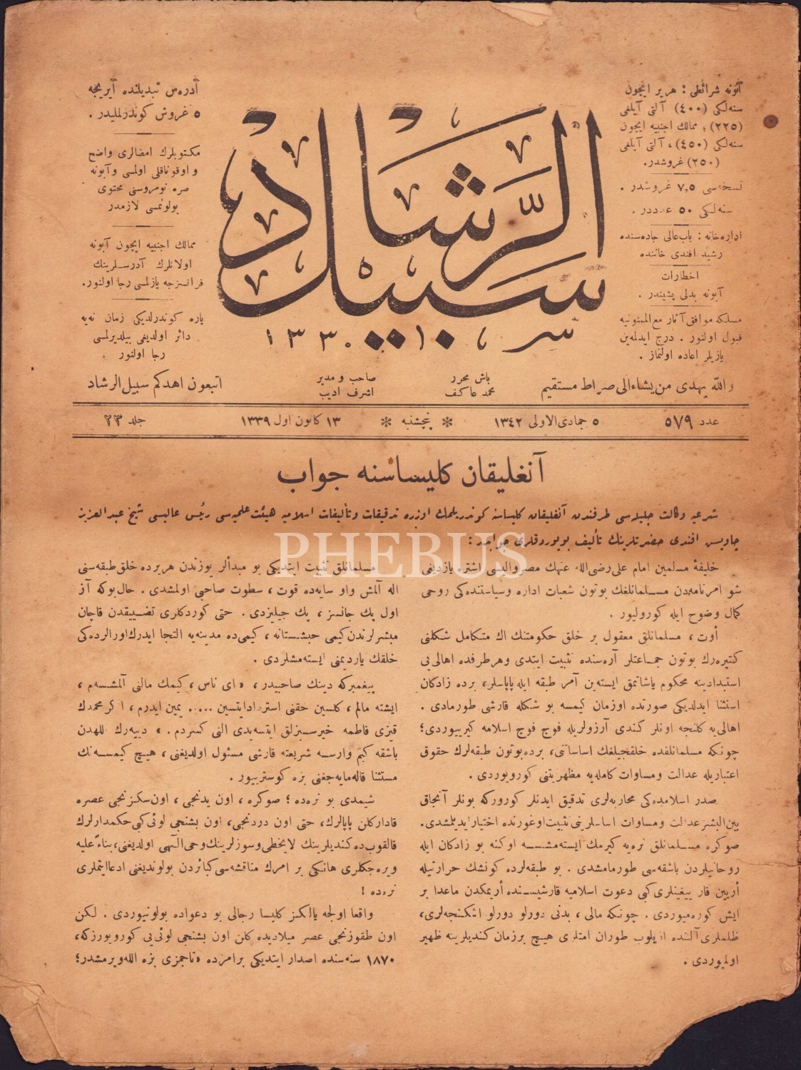 Osmanlıca Sebilürreşad mecmuası, 1339, baş muharriri Mehmed Akif, sahibi Eşref Edip, manşet "Anglikan Kilisesine Cevap", sırtı haliyle, bir kenar tamamen kopuk, 14 sayfa, 23x30 cm
