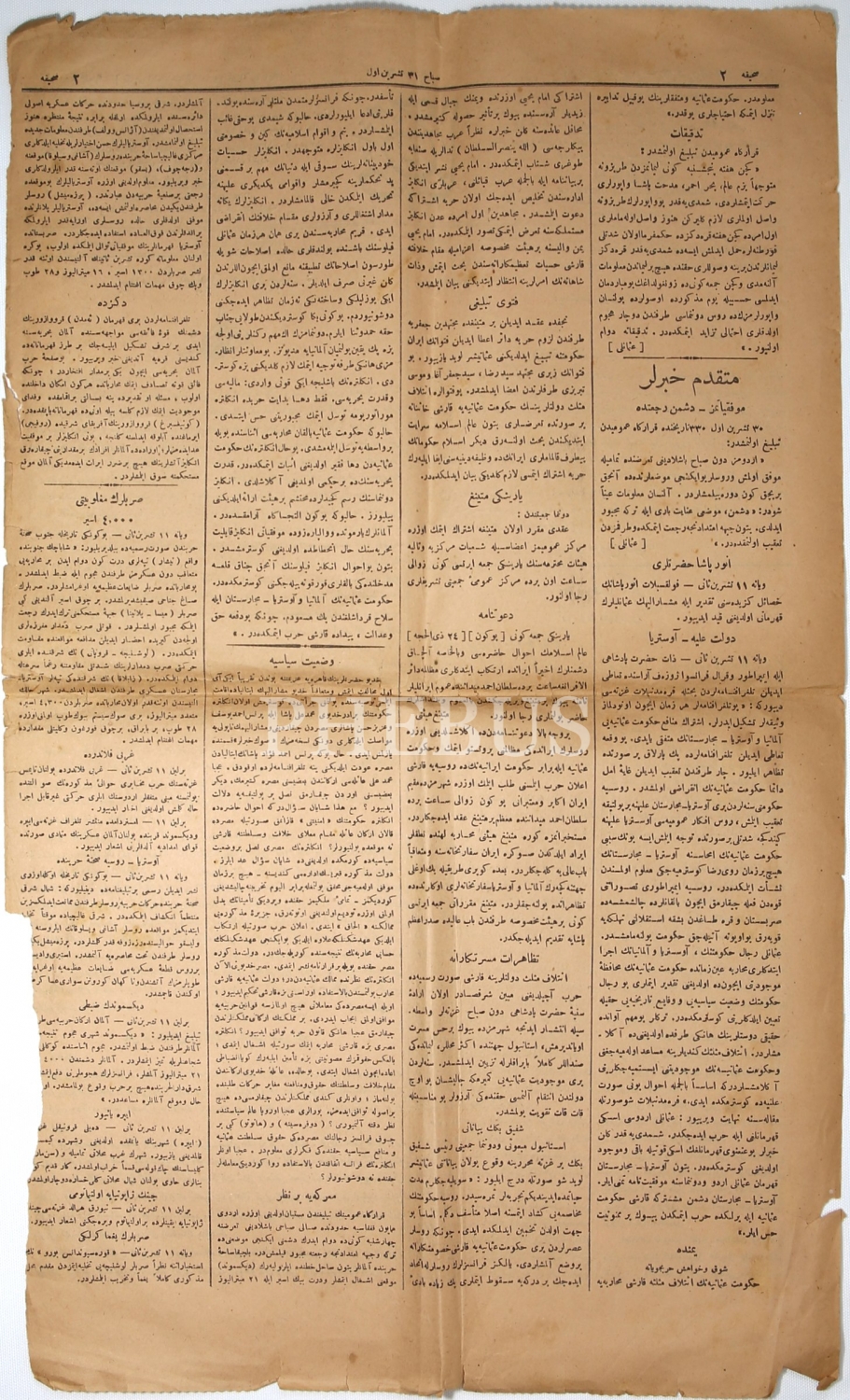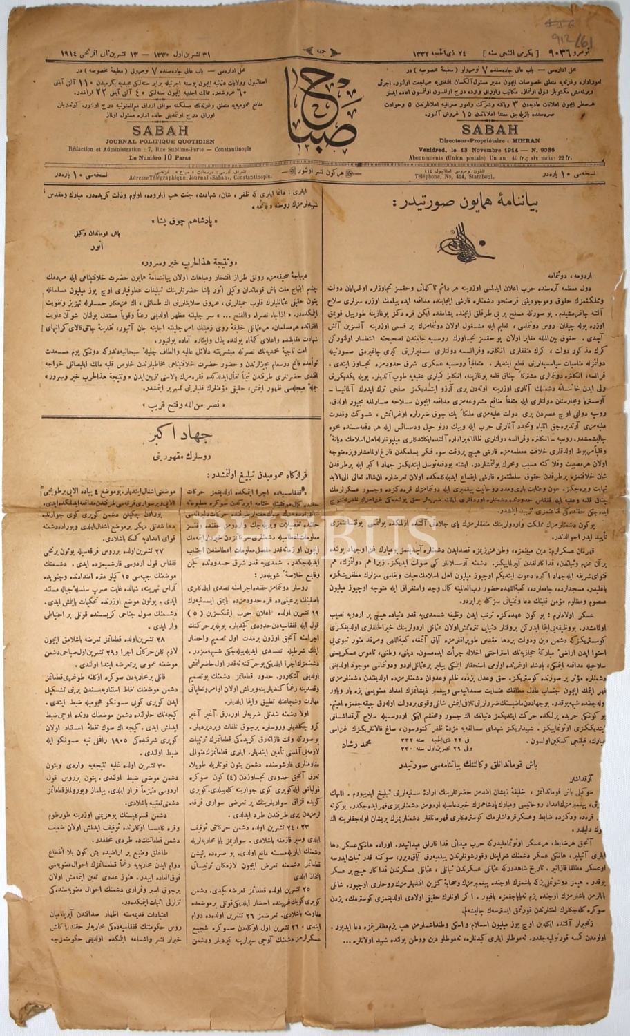 Osmanlıca Sabah gazetesi, 1914, "Beyanname-i Hümayun Sureti", "Cihad-ı Ekber", tek sayfa, 33x54 cm