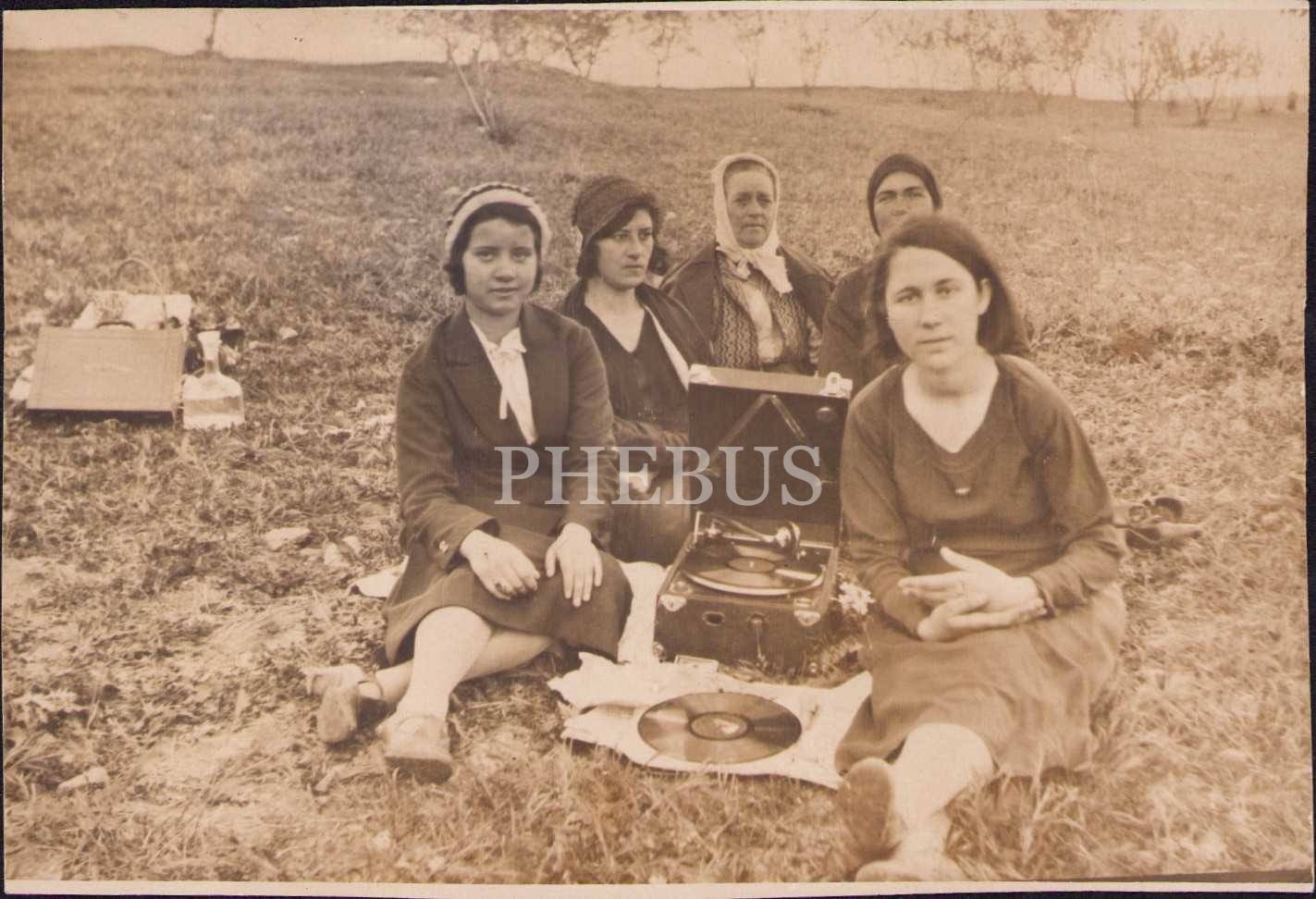 Erken dönem kadınlar piknikte pikap dinlerken, 13x8 cm